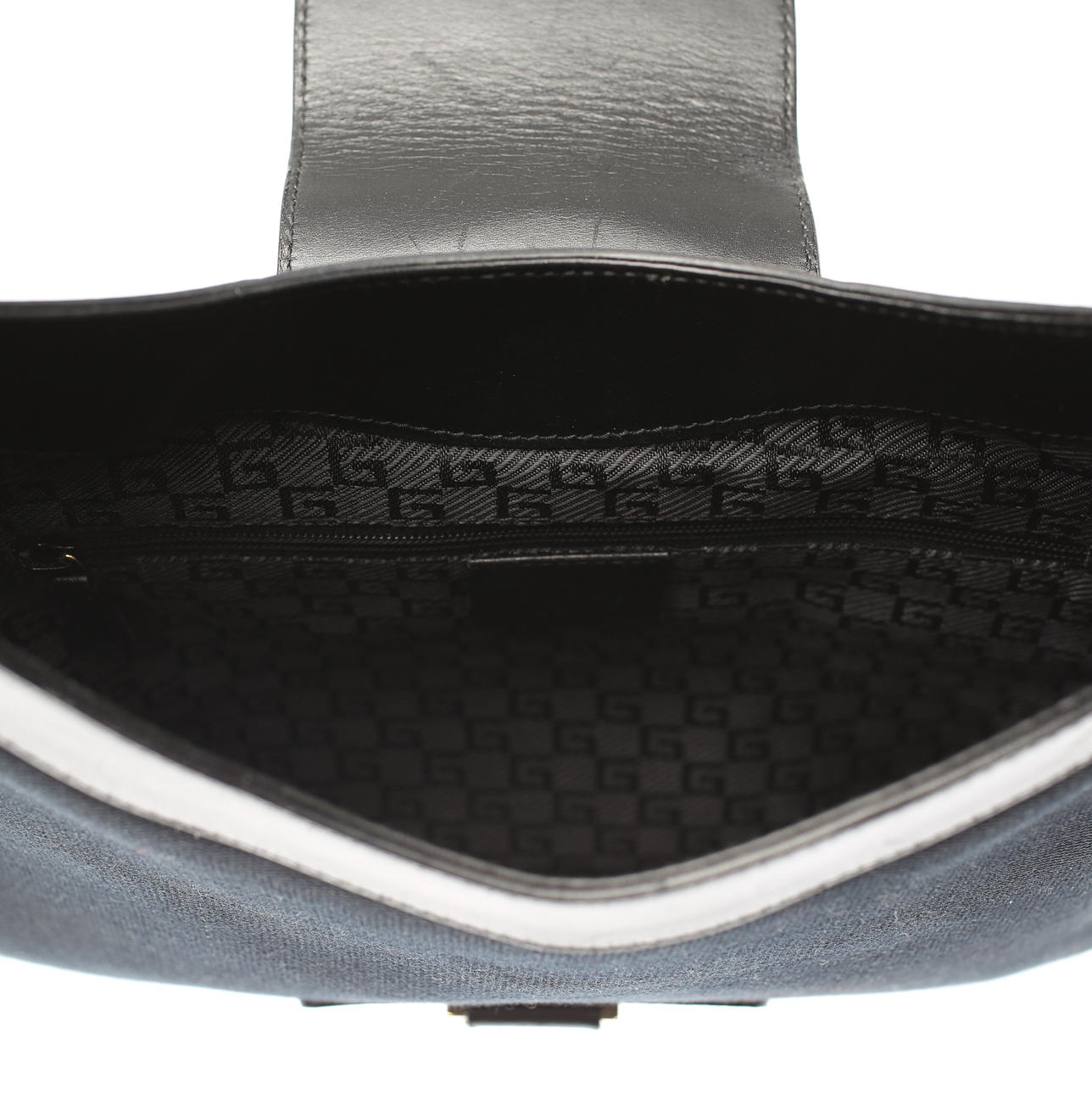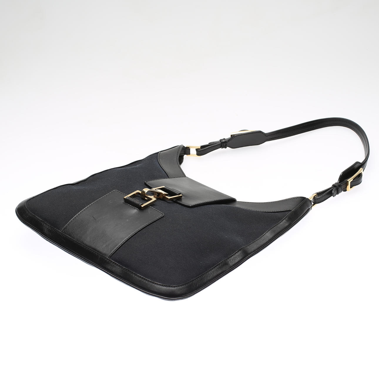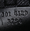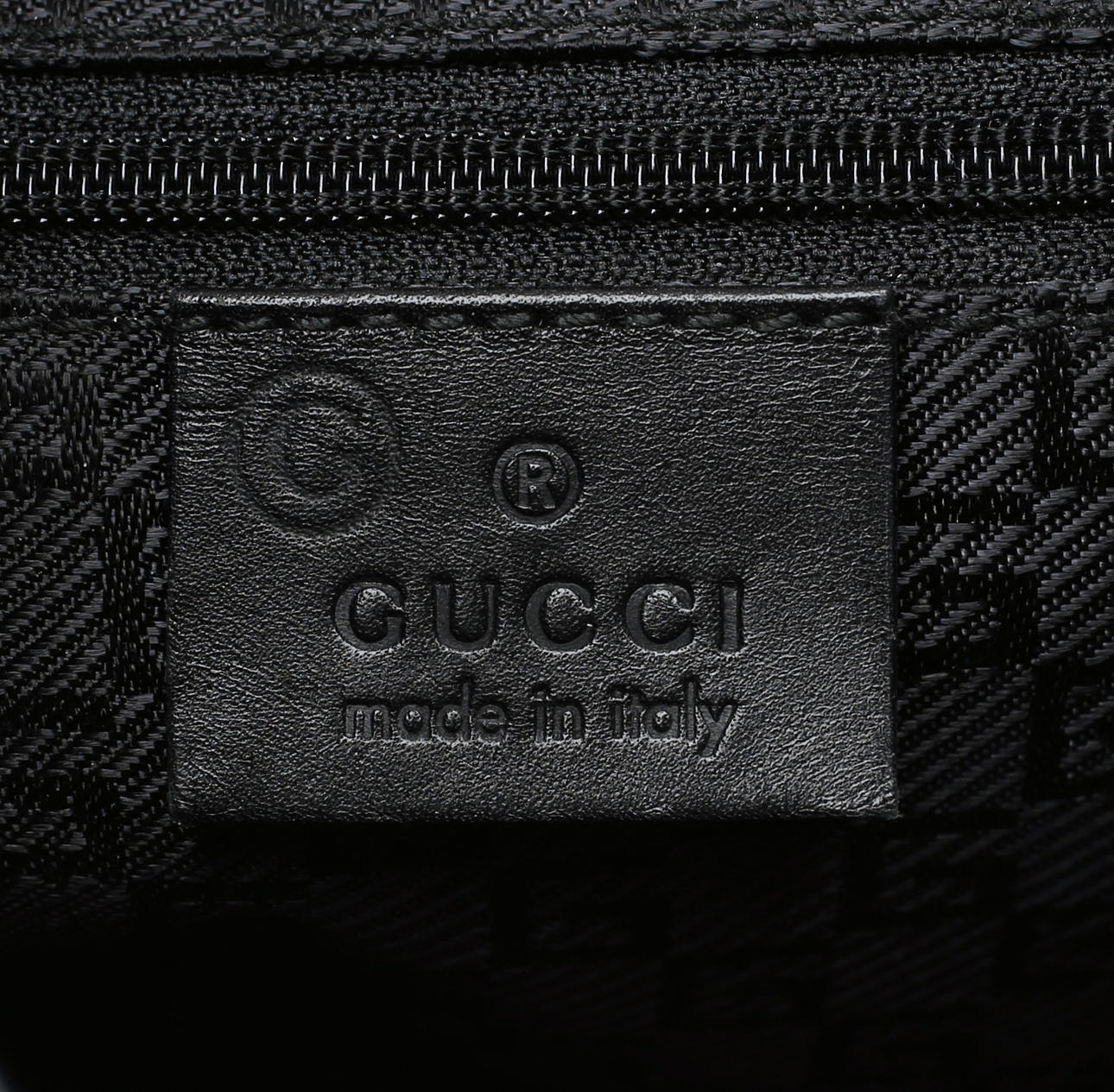 Nahkaa ja kangasta. Kullanväriset soljet. Merkintä "Gucci made in Italy" ja numeroitu. Leveys noin 29. Korkeus noin 39 cm.