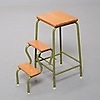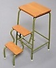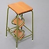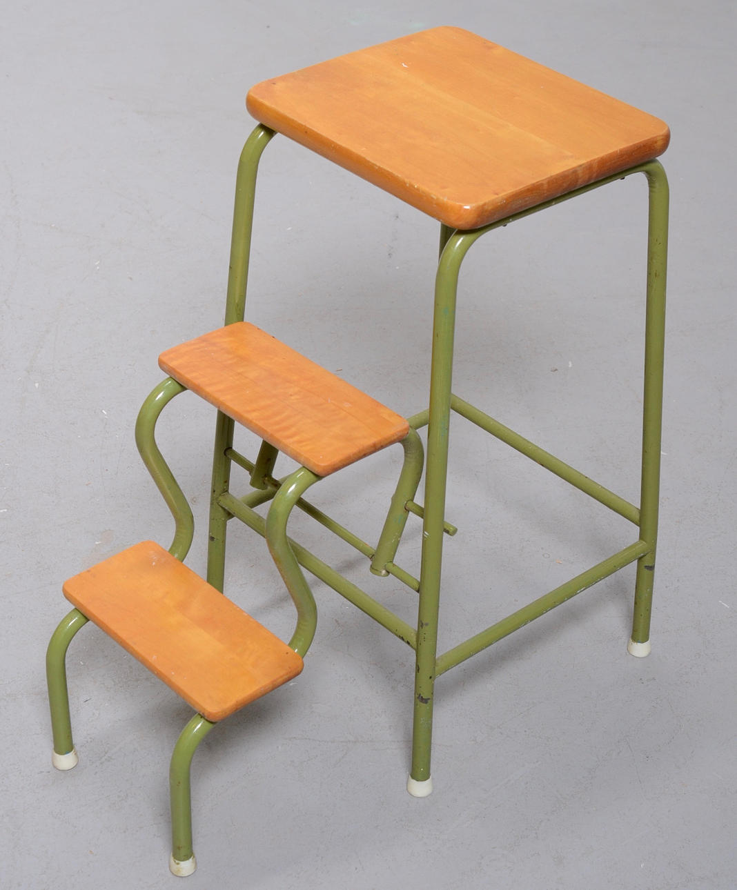 Vihreäksi lakattu metallirunko, vaaleat puuportaat.