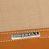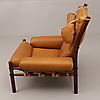 Runko petsattua puuta ja löysät tyynyt päällystetty ruskealla nahalla.