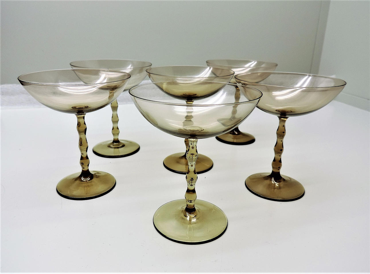 6 siroa lasia Simon Gaten mallista "Stork" Sandvikin Orreforsin lasitehtaalla Mitat noin: K9,5cm - Ø 8,3cm.