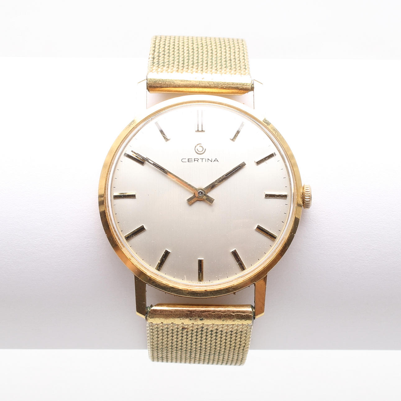 Rannekello, Certina, valkoinen kellotaulu, manuaalinen liike, kotelo 18K kultaa, rannekoru tuplakultaa.