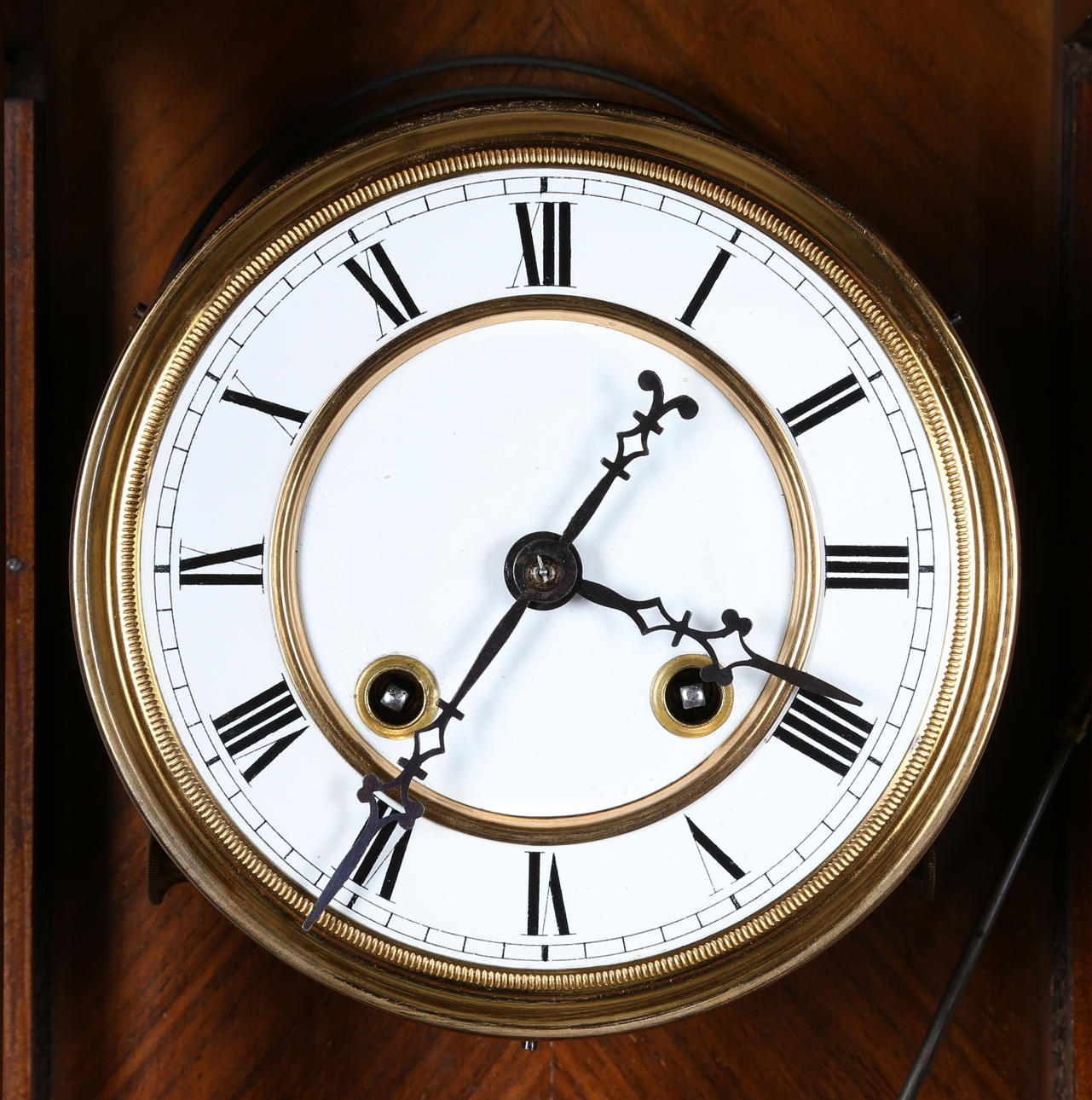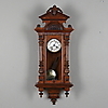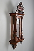 Pähkinäviilutettu. Leikattu ja sorvattu sisustus. Liikkeen sarjanumerolla "924443". Kello, jossa merkintä luettelossa "Tämä kello oli siellä, kun Carl ja Ida menivät naimisiin s. 20/6 1891". Korkeus noin 105 cm.