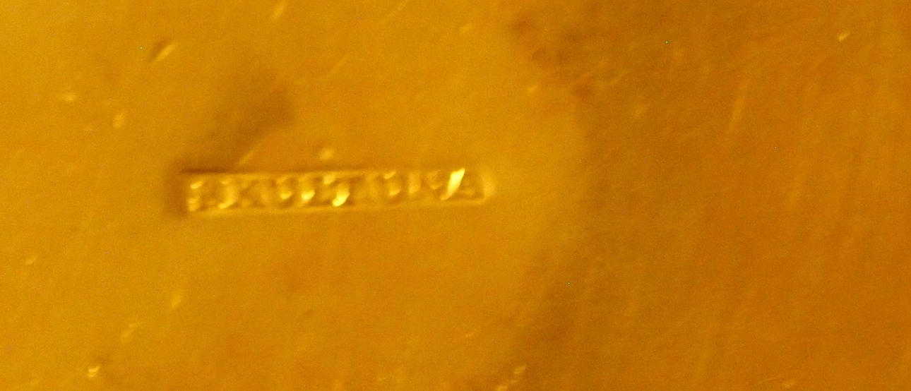 Pohjassa merkintä, pienestä...halkaisija mitattuna alla. Suora leima, Skultuna 4, halkaisija 17 cm.