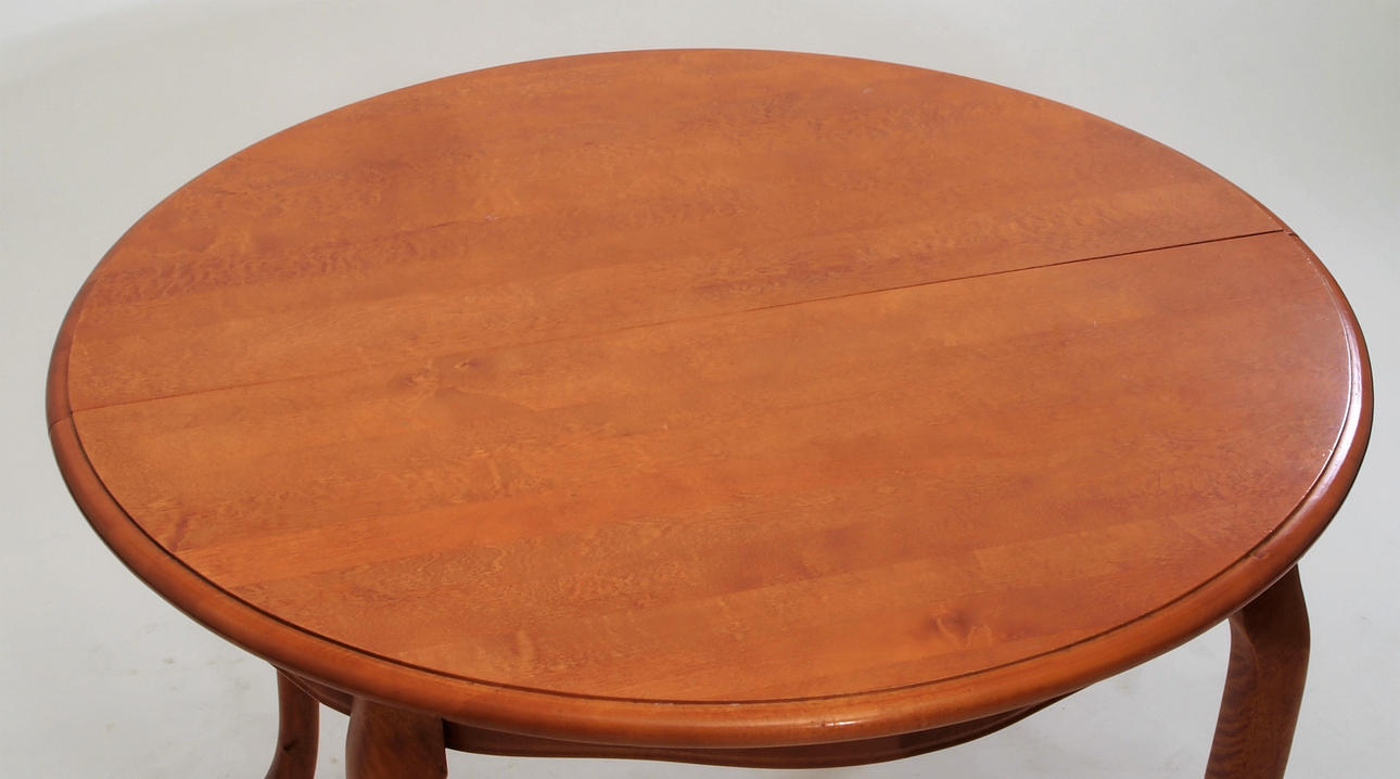 Pyöreä ruokapöytä halkaisija 110 cm kahdella 55 cm lautasella. Kokonaispituus 220 cm Korkeus 74,5 cm Nykyaikaisempi valmistus.