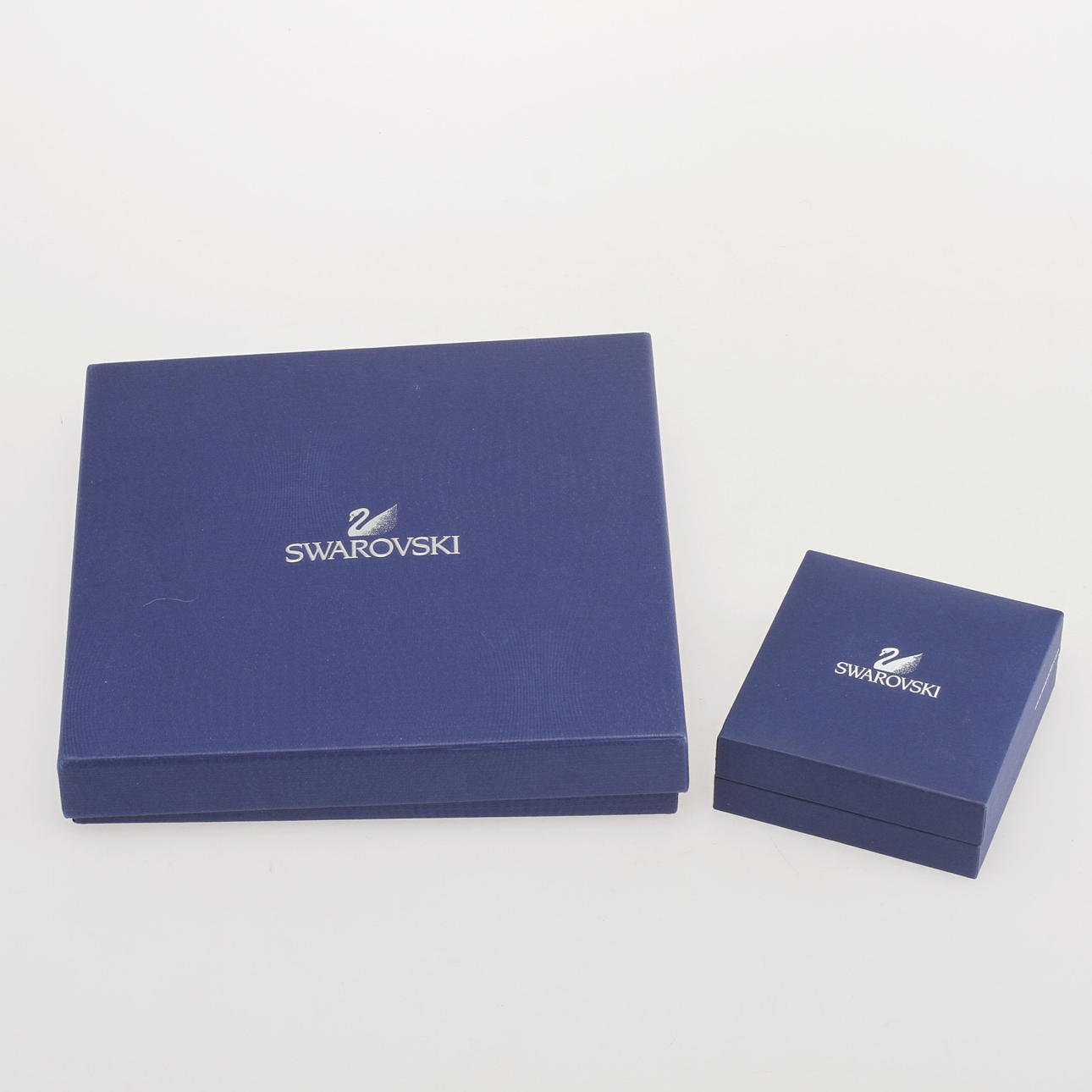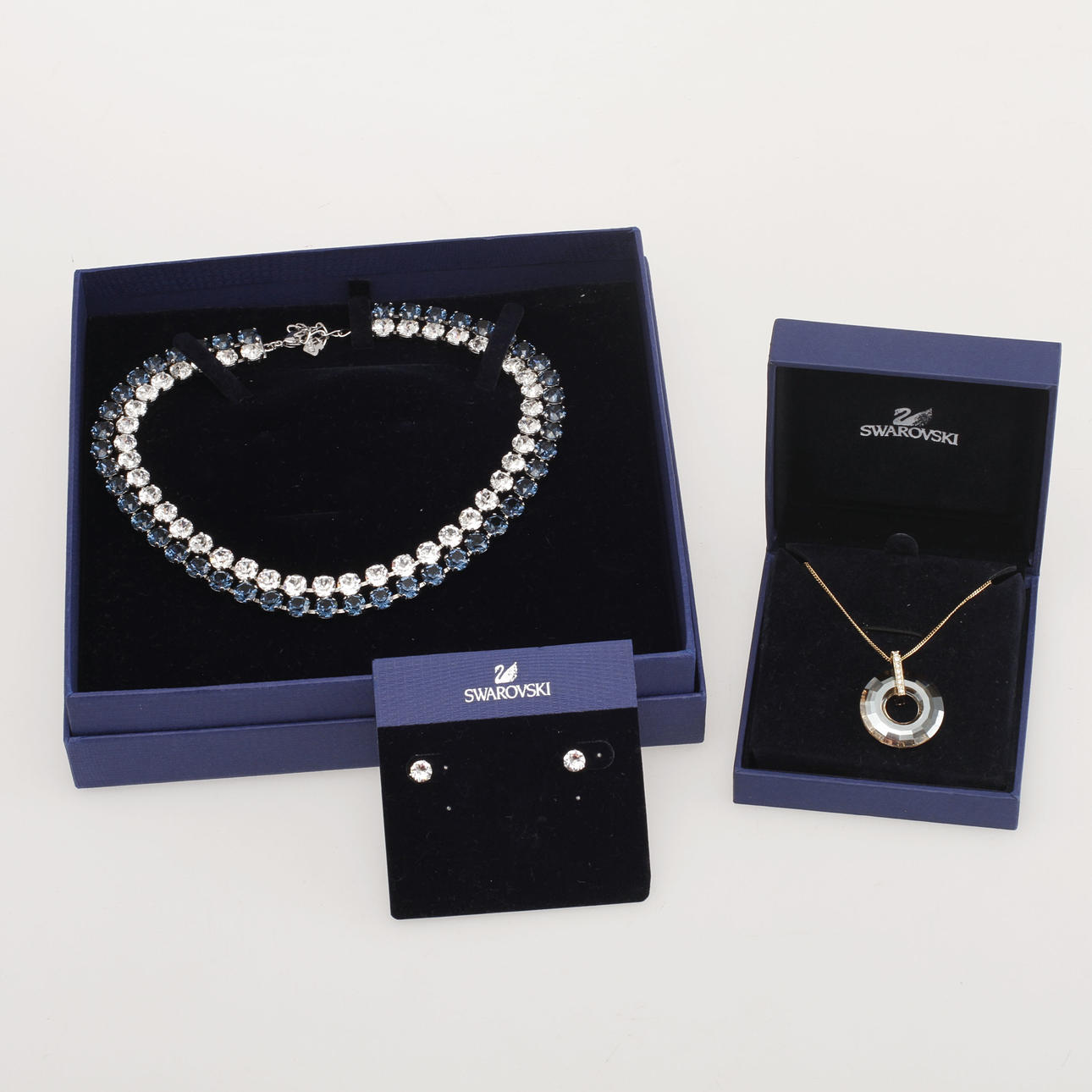 Kaulakoru, jossa valkoisia ja sinisiä strassit ja valkoista metallia, pituus n. 36 cm. Korvakorut strassit n. 6 mm. Kaulakoru keltaisella metalliriipuksella ja strassilla, pituus n. 42 cm. Riipuksen korkeus noin 3 cm. Mukaan lukien alkuperäiset laatikot.