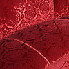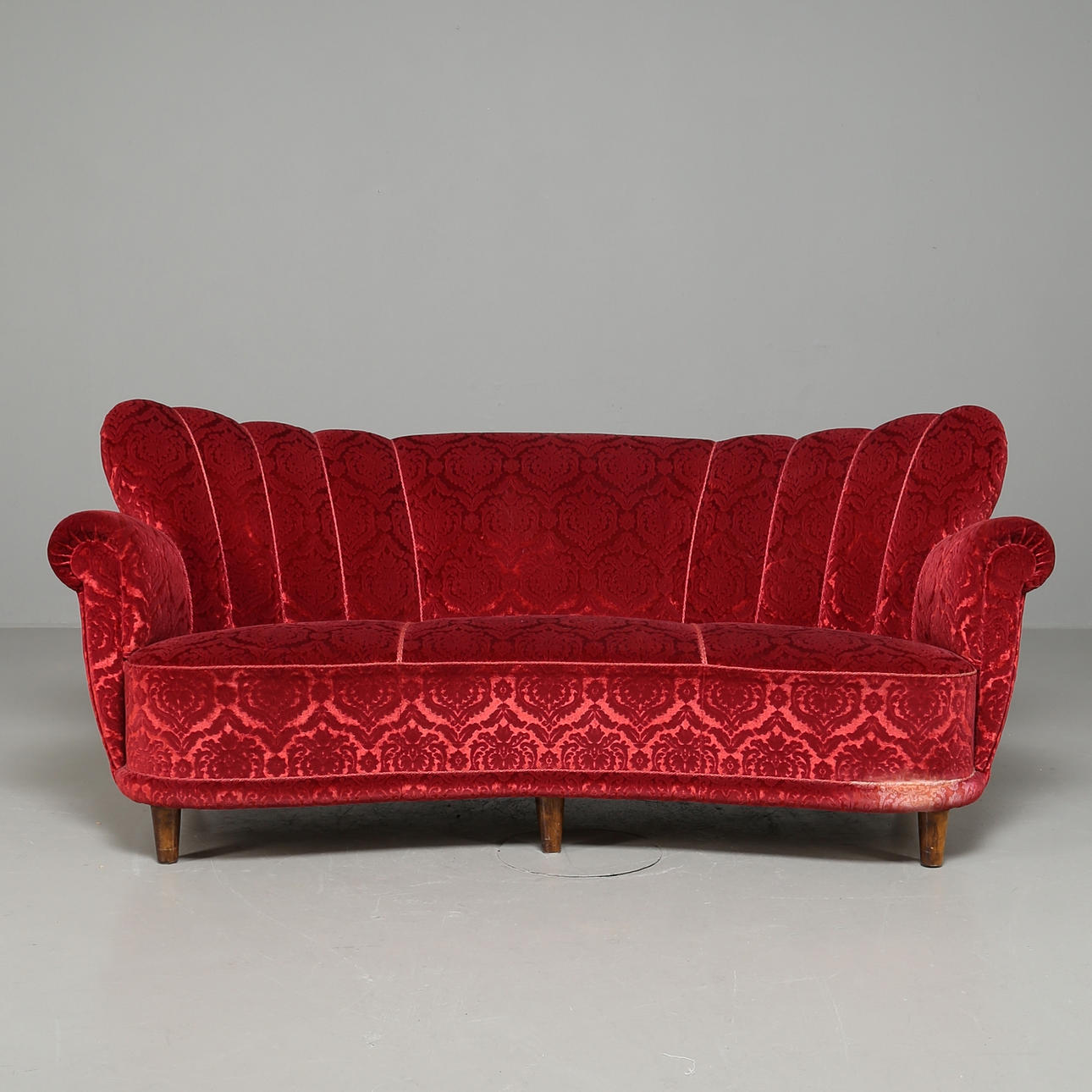 Kaareva istuin, syvästi pehmustettu selkänoja viuhkamaisissa osissa ja täysin verhoiltu ylöskäännetyt käsinojat. Petsatut kovapuujalat. Tummanpunainen, leikattu pehmo, jossa medaljonkikuvio.