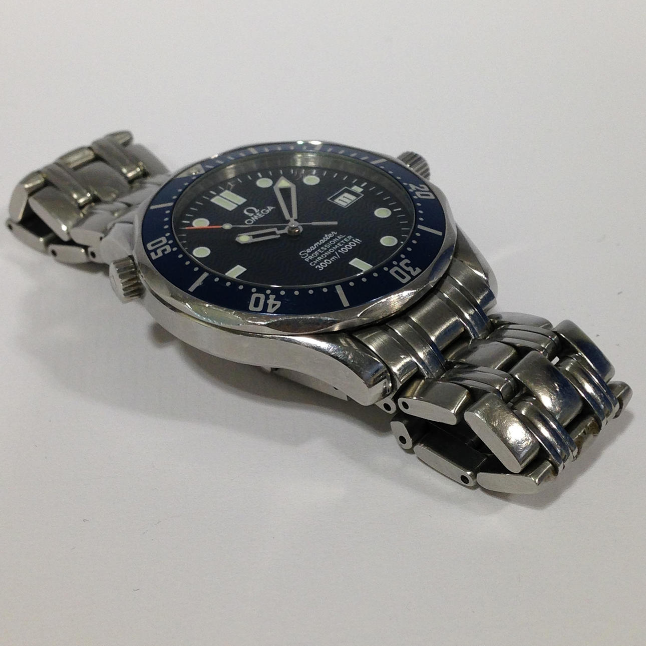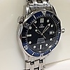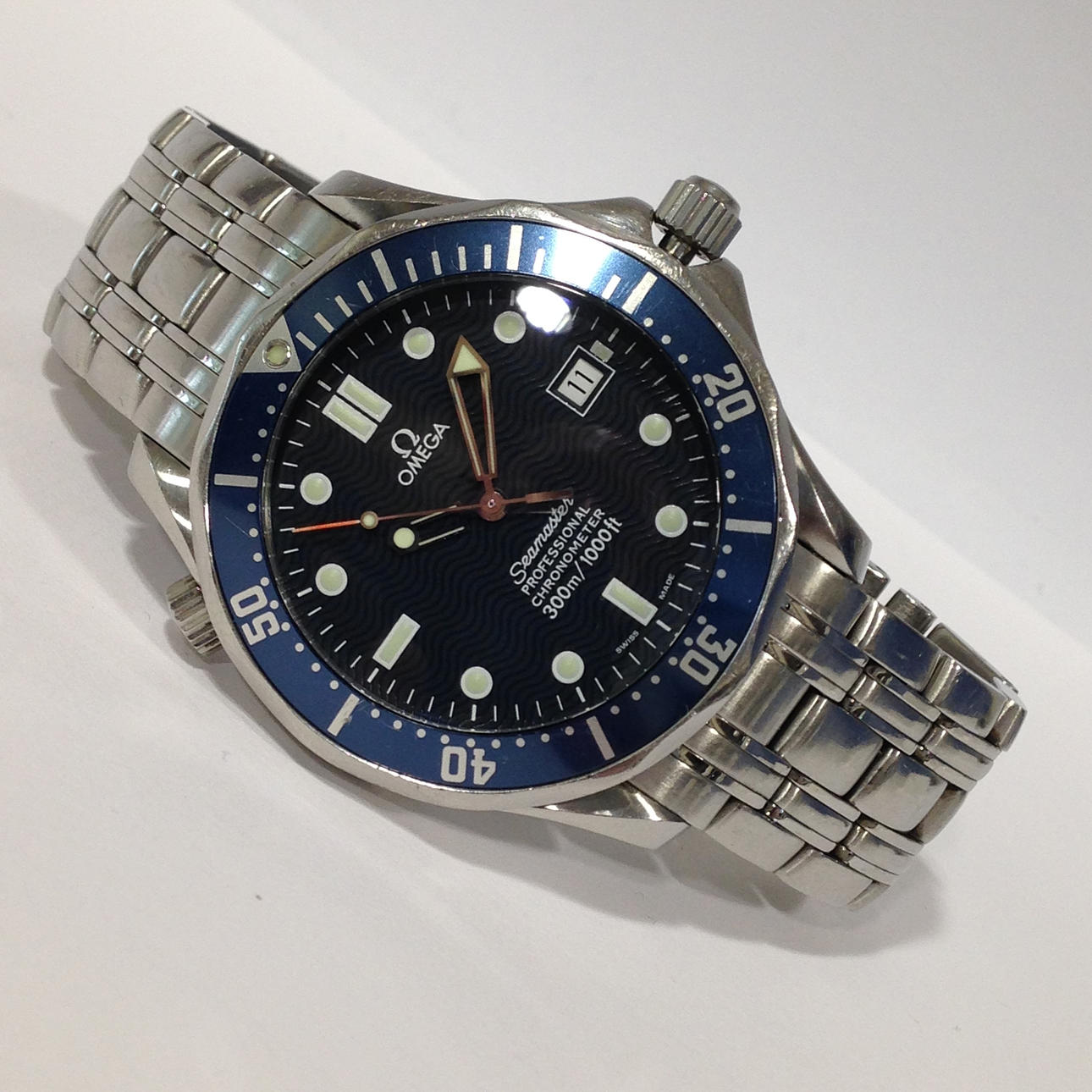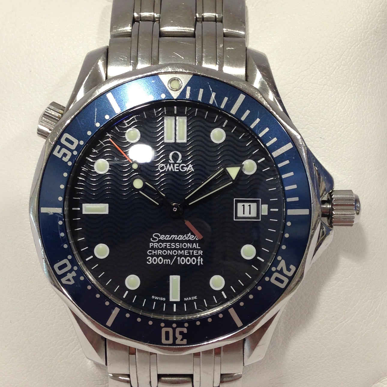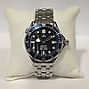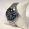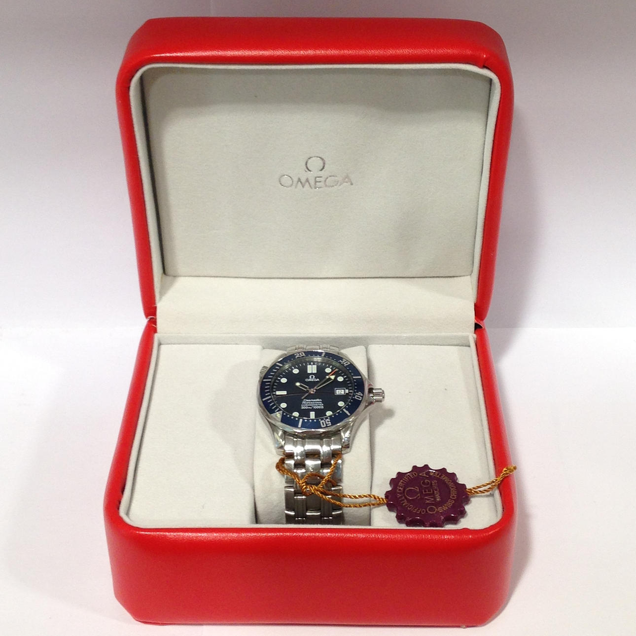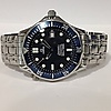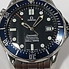 Omega seamaster -ammattilainen Tämä on sama malli kuin Pierce Brosnanin Bond-elokuvissa käyttämä kello. Tämä on ammattisukelluksen kello, joka on mitoitettu 300 metrin syvyyteen ja varustettu kronometritason liikkeellä Kellossa on heliumkaasun poistoventtiili puristuskammioihin. on ei-koaksiaalinen malli, jota tulee myyntiin harvoin Kellon tekniset tiedot: Liike: mekaaninen automaattikäämitys n.1120,merkitty kronografi Mitat: 36mm x 43mm x 12mm Lasi: safiirilasi Kotelo: kiillotettu teräs, ruuvilukkokruunu, pyörivä kehys Kellotaulu: sininen aalto , valopisteet Ranneke : teräsranneke , signeerattu kiinnityslukko Kädet : teräs , valaiseva Toiminto : aika/päivämäärä kronografi , syvyys 300 metriä , helium pakoventtiili Kellon paino : 158,0 grammaa Kellon mukana tulee punainen nahkainen omega - laatikko , nahkainen kortti pussi ja huoltokeskusvihko Laatikko , pussi , vihko , laukku , kellotyyny , omega - logomerkki , ulkokotelon kansi ja kantolaukun paino : 581,3 grammaa Kokonaispaino : 739,3 grammaa.