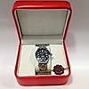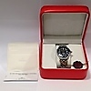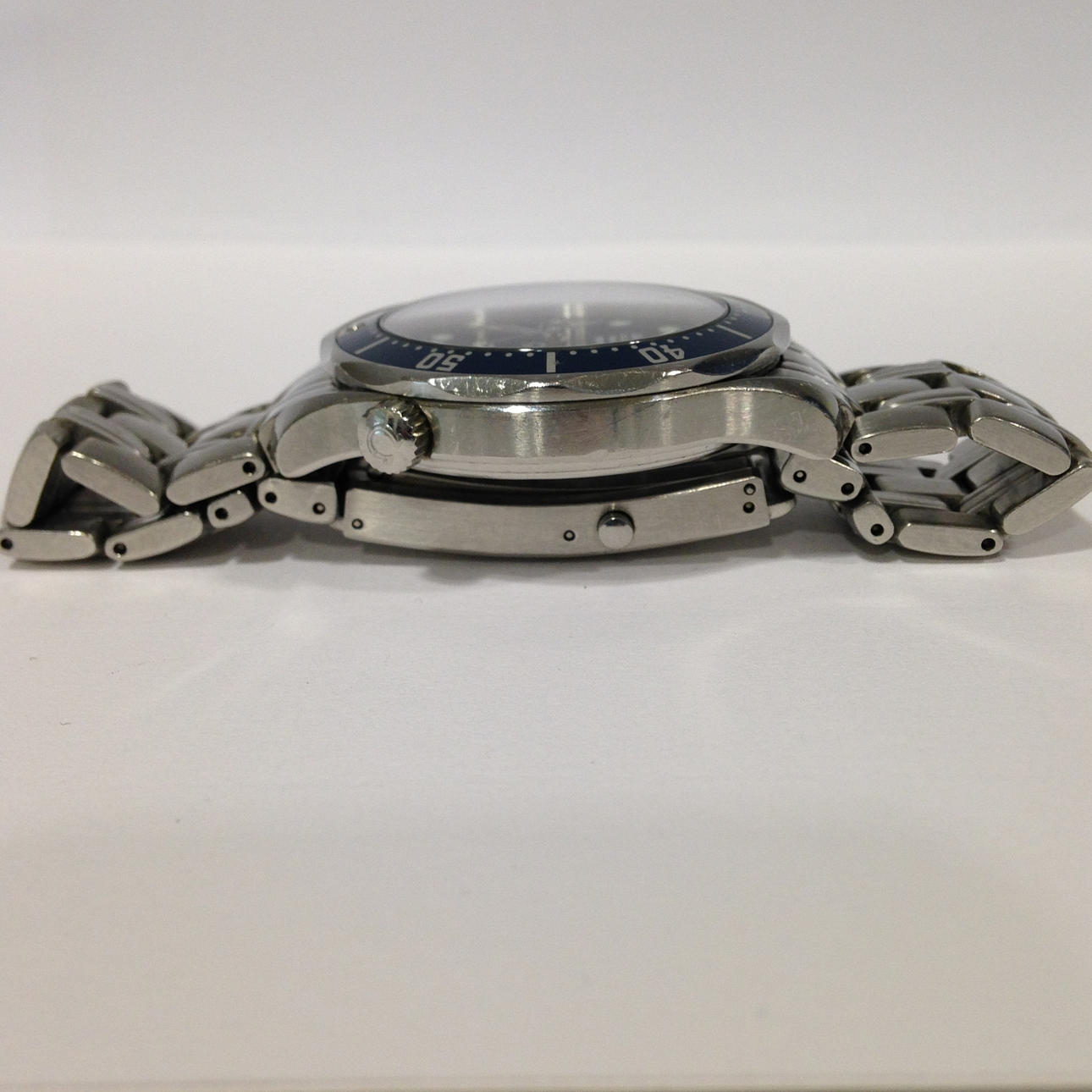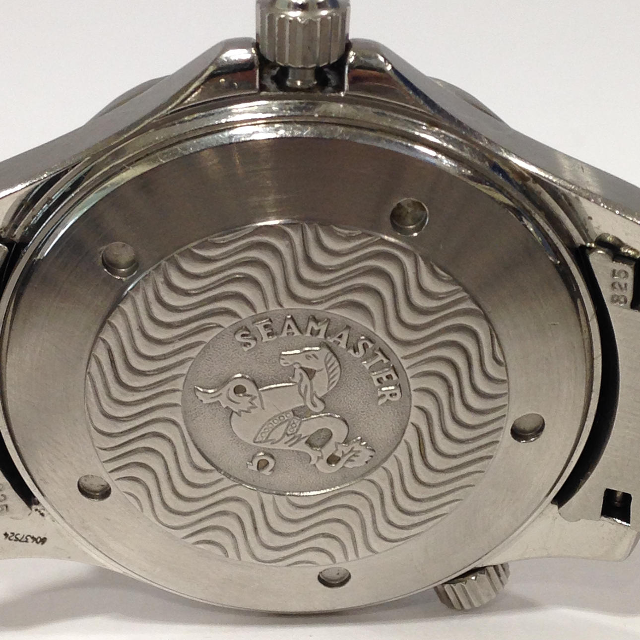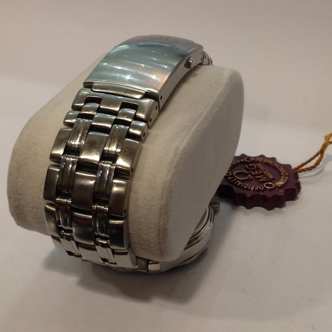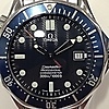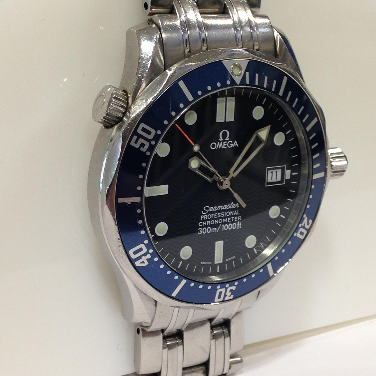Omega seamaster -ammattilainen Tämä on sama malli kuin Pierce Brosnanin Bond-elokuvissa käyttämä kello. Tämä on ammattisukelluksen kello, joka on mitoitettu 300 metrin syvyyteen ja varustettu kronometritason liikkeellä Kellossa on heliumkaasun poistoventtiili puristuskammioihin. on ei-koaksiaalinen malli, jota tulee myyntiin harvoin Kellon tekniset tiedot: Liike: mekaaninen automaattikäämitys n.1120,merkitty kronografi Mitat: 36mm x 43mm x 12mm Lasi: safiirilasi Kotelo: kiillotettu teräs, ruuvilukkokruunu, pyörivä kehys Kellotaulu: sininen aalto , valopisteet Ranneke : teräsranneke , signeerattu kiinnityslukko Kädet : teräs , valaiseva Toiminto : aika/päivämäärä kronografi , syvyys 300 metriä , helium pakoventtiili Kellon paino : 158,0 grammaa Kellon mukana tulee punainen nahkainen omega - laatikko , nahkainen kortti pussi ja huoltokeskusvihko Laatikko , pussi , vihko , laukku , kellotyyny , omega - logomerkki , ulkokotelon kansi ja kantolaukun paino : 581,3 grammaa Kokonaispaino : 739,3 grammaa.