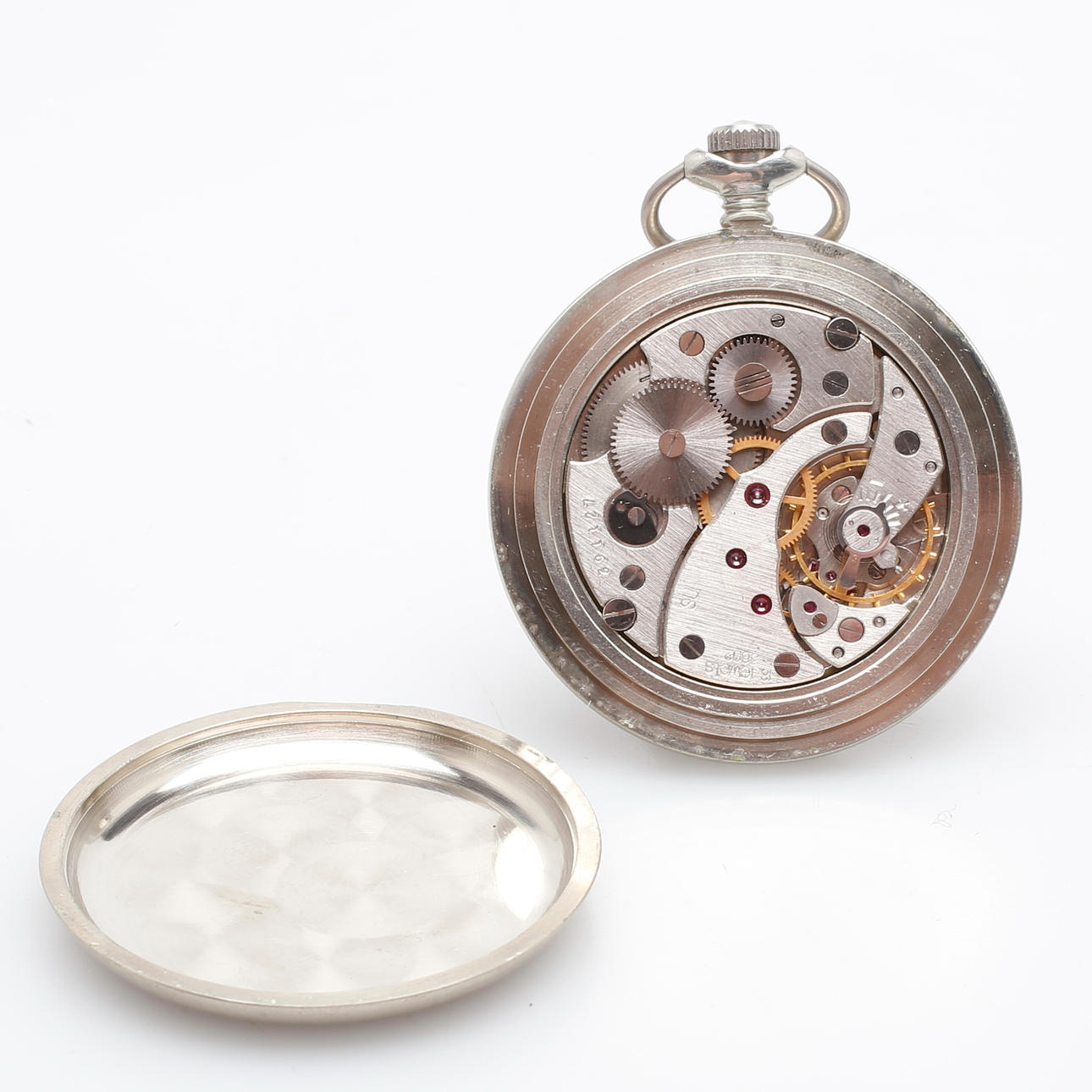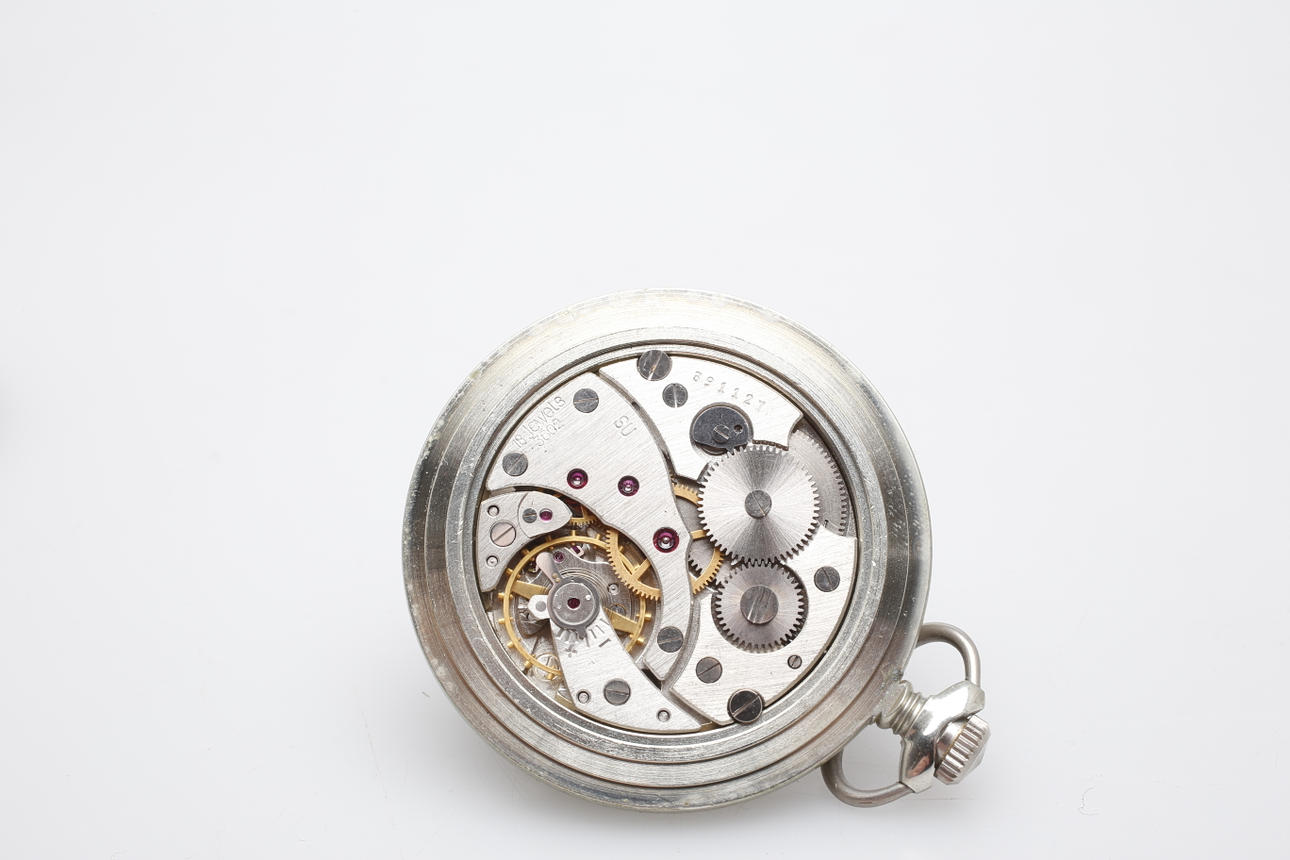 Kotelon takaosassa kohokuvioitu junakuva. Valkoinen kellotaulu arabialaisilla numeroilla, merkintä Corsar 17 Steine. Sarjanumero 391127.