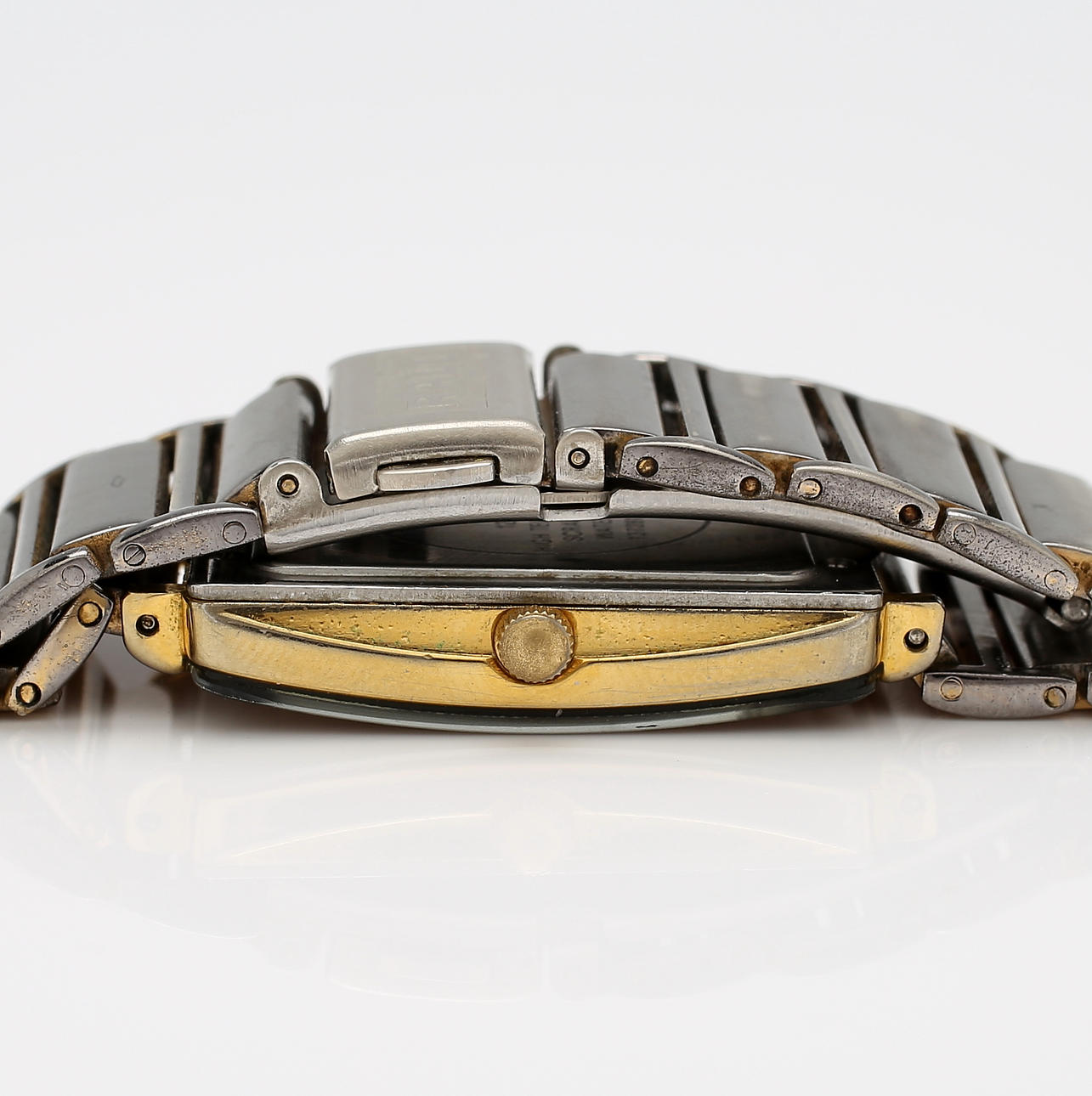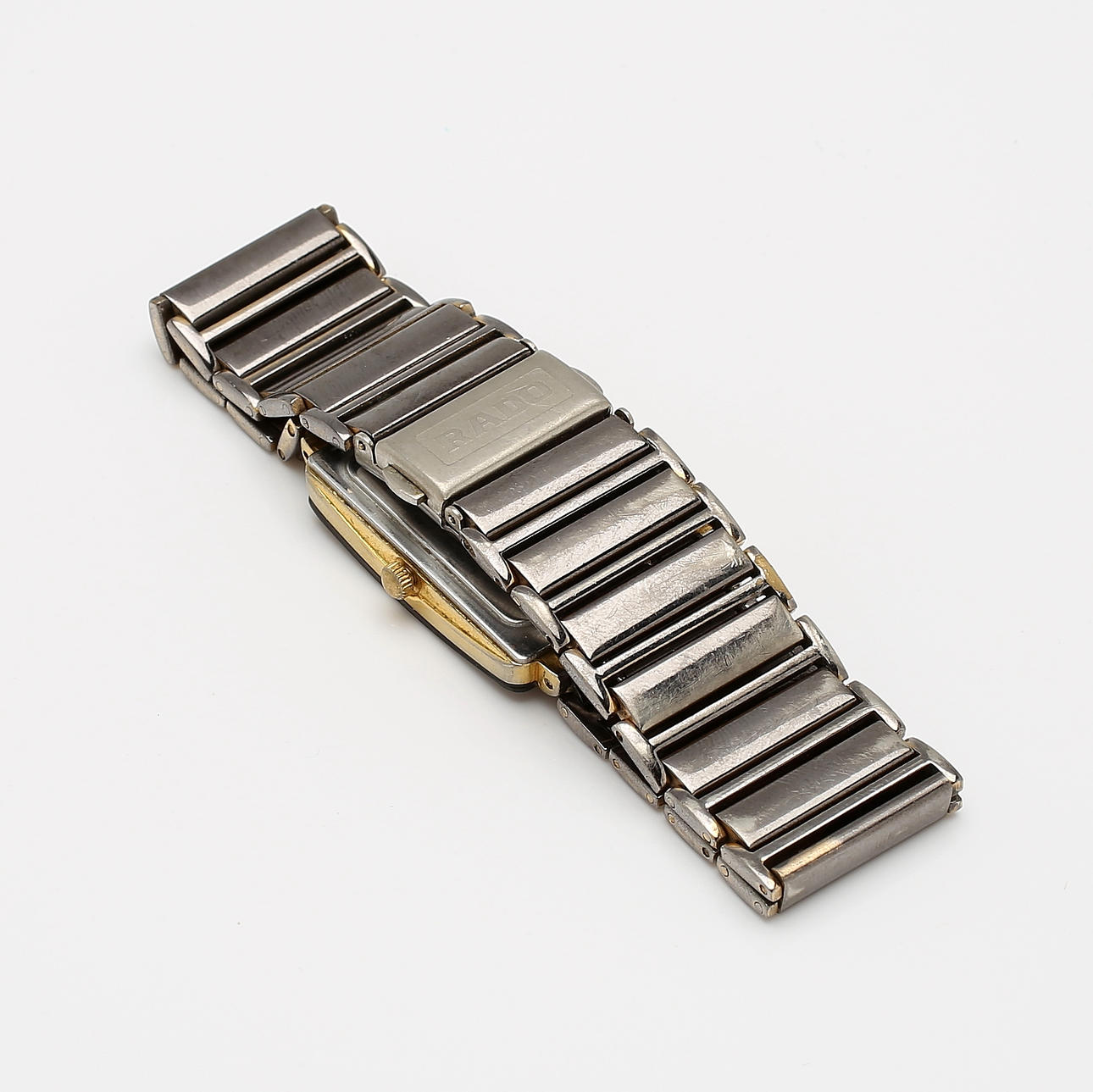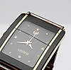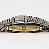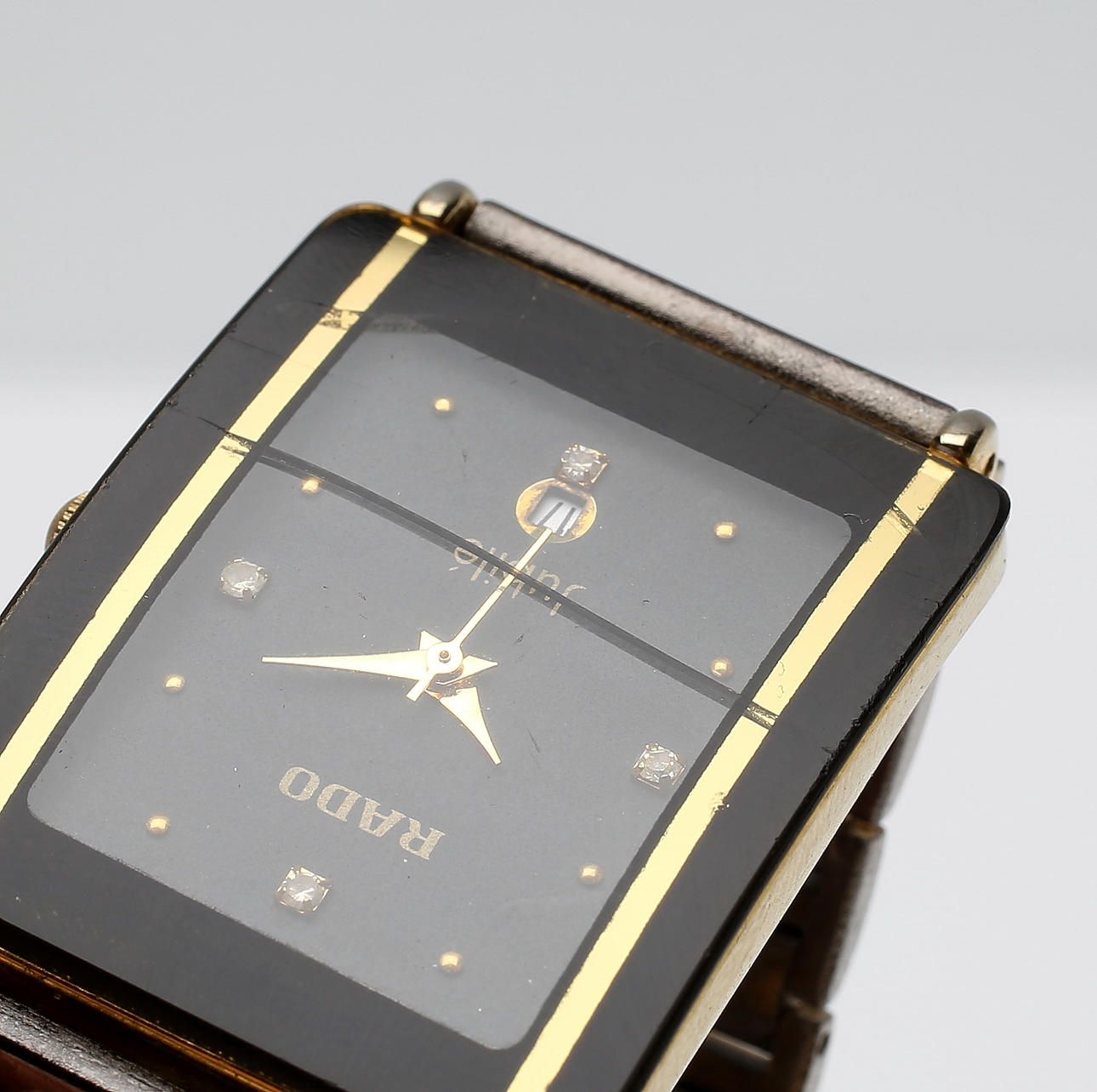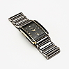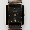 Kvartsi. Tumma kellotaulu, jossa on neljä kiveä ja päivämääräikkuna. Linkkirannekoru, jossa taitettava lukko. Noin 33 x 26 mm.