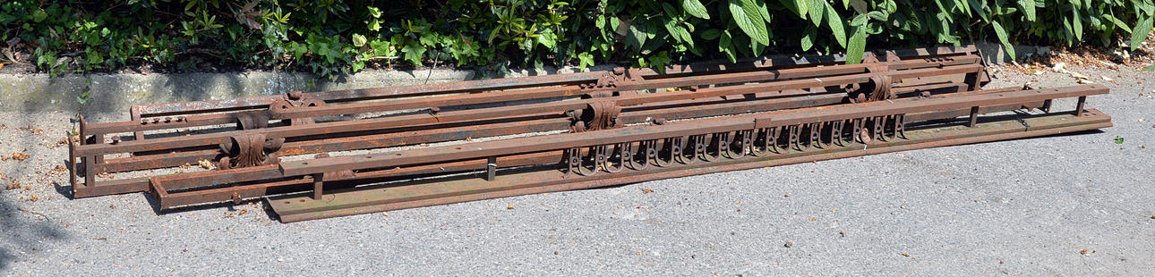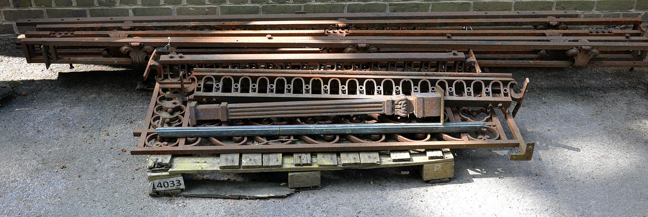 luultavasti kaiteiden elementtejä, 1800-luvun lopulla, joka koostuu harjakattoisesta paneelista, jossa on aaltomainen ja vierivä yksityiskohta, 100 cm korkea, 156 cm leveä; pienempi esimerkki, samanlainen; ja erilaisia muita pituuksia rautatyöt.