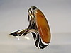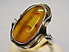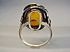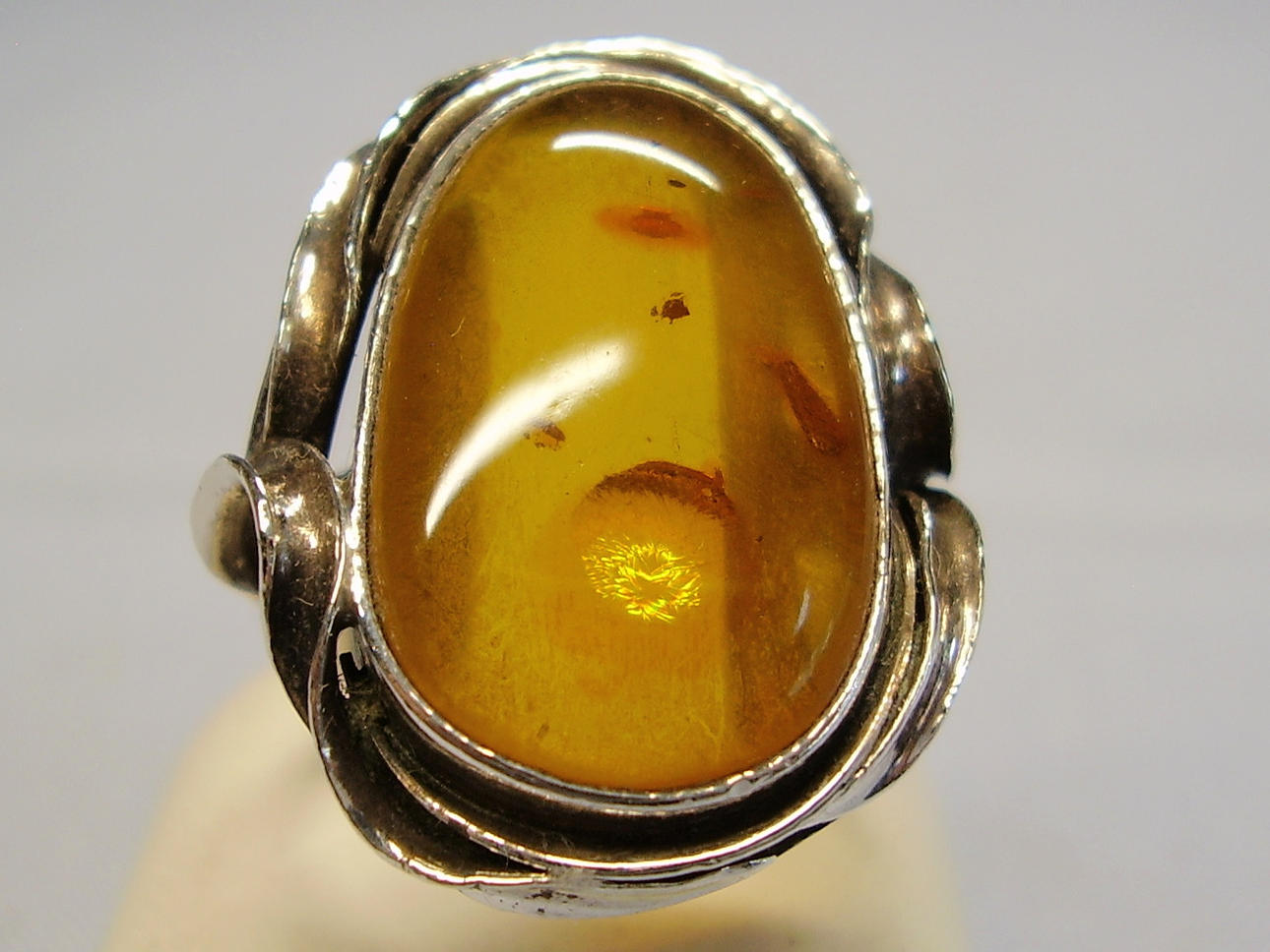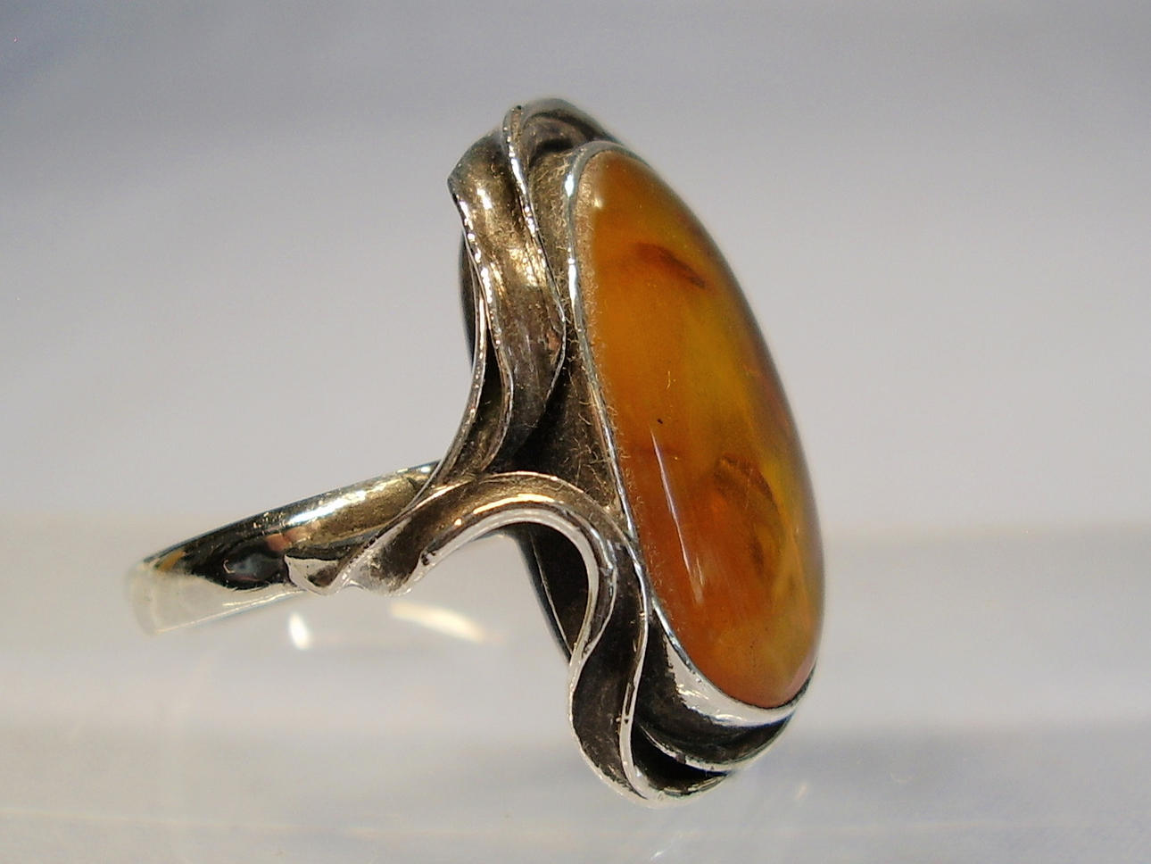 Käsin taottu rengaspää on varustettu suurella, läpinäkyvällä hunajakeltaisella kabokonilla, jossa on luonnollisia sulkeumia. Tätä pitää sileä runko, ja sitä ympäröi koristeellinen asetelma, joka on tehty yhteen kietoutuneista hopeanauhoista, joissa on osittainen nielloing.
