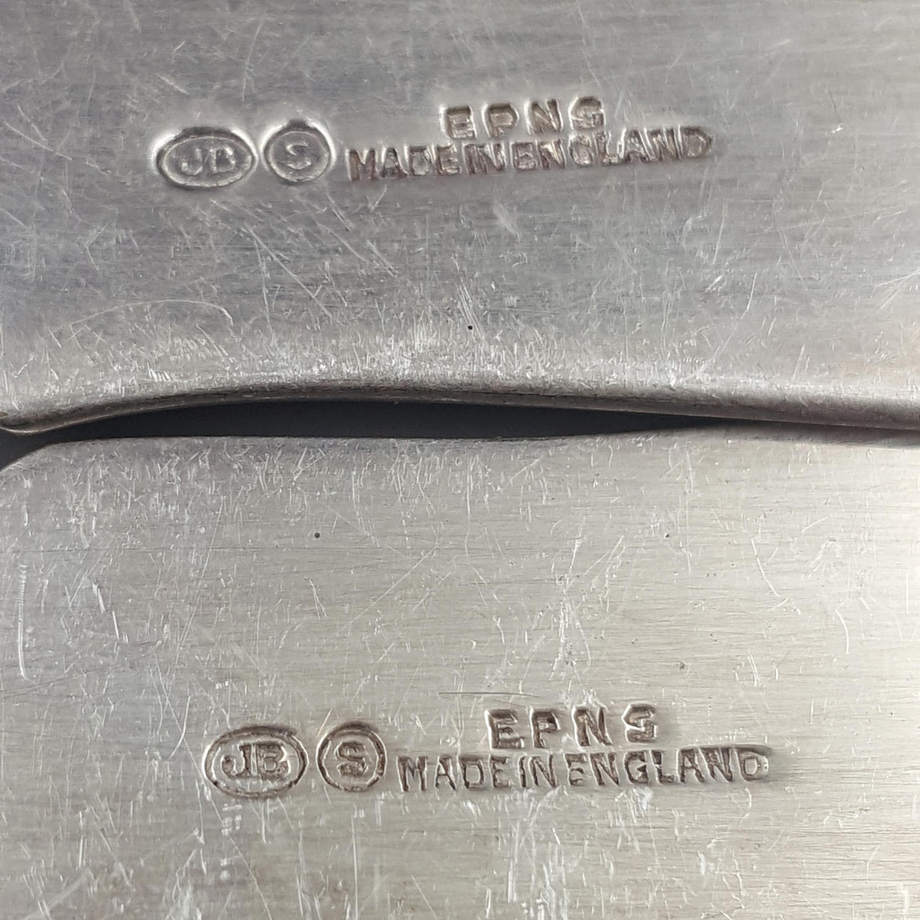 2 jälkiruokaveistä, helmiäinen/hopea leima, JB.S.
