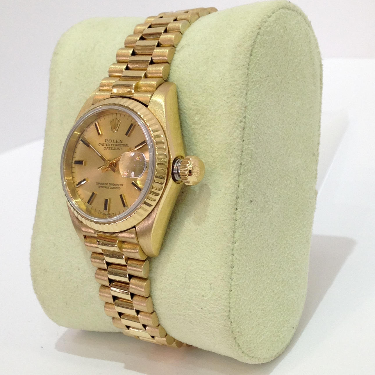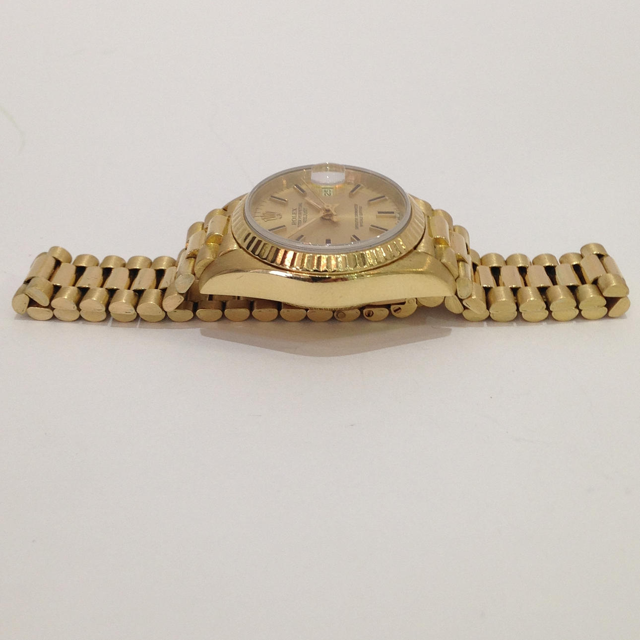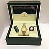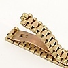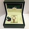 Kellon etupuoli on samppanjaa / kultaa, ja siinä on Rolex-kruunu kello 00.00.