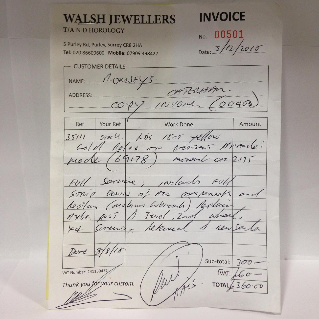 Mukana on myös kellojen huoltolasku: täysi nauha kaikista komponenteista ja voiteluaineista, uusi akselitolppa ja jalokivi, toinen pyörä ja 4x uudet ruuvit ja sinetöity uusilla tiivisteillä Rolex-laatikko on suojattu ulkolaatikolla ja holkilla (katso kuvat).