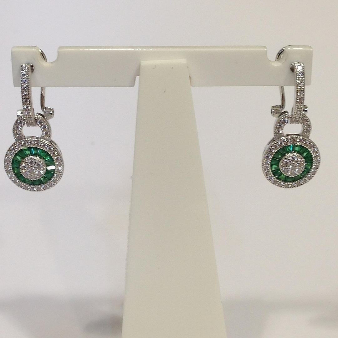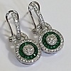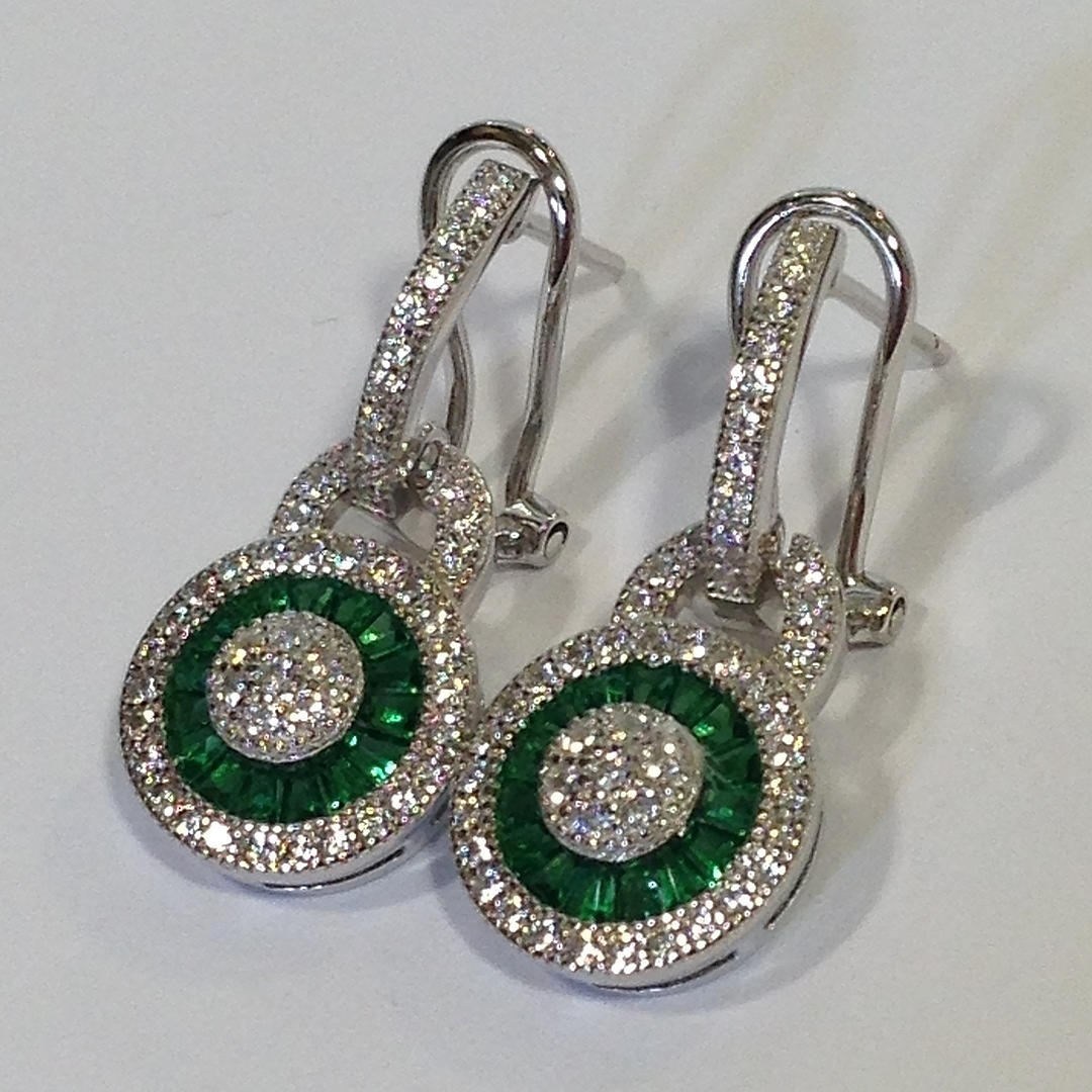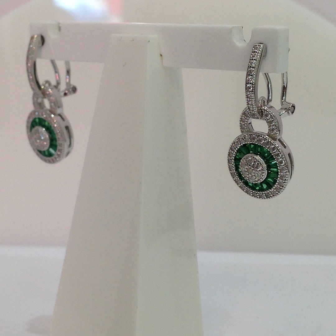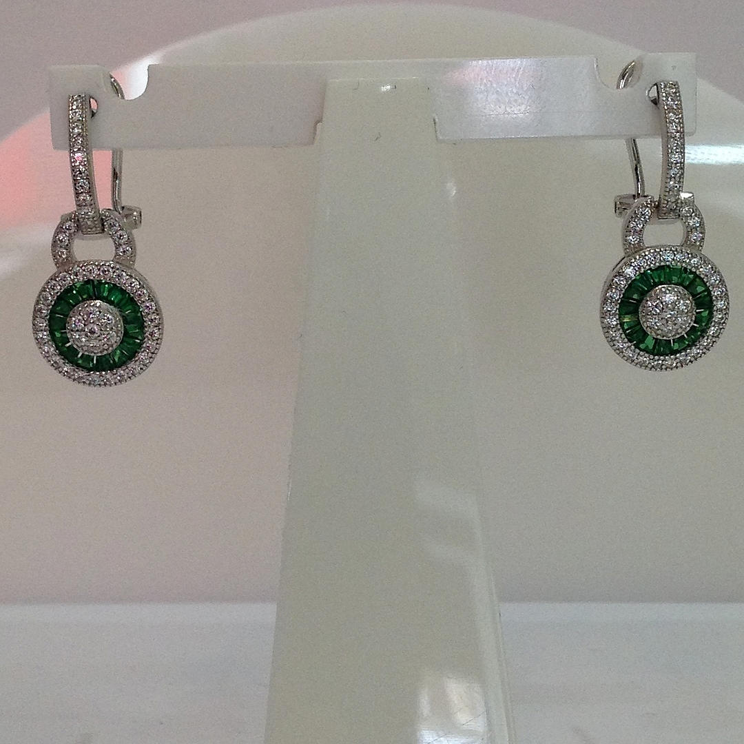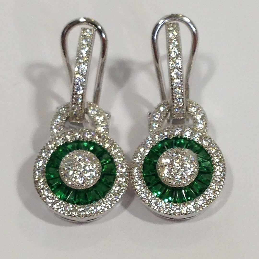 Nämä korvakorut ovat hopeaa (leimattu "925") Näiden korvakorujen keskellä on rypäle valkoisia pyöreitä briljanttileikattuja kuutioisia zirkoniakiviä Tätä kivirypäletä ympäröi patonkileikattujen vihreiden kuutioiden zirkoniakivien sädekehä. On myös toinen sädekehä valkoista pyöreää loistavia leikattuja kuutiometrisiä zirkoniakiviä sinisen halon ympärillä Korvakorujen riipus yhdistyy kuutiozirkoniasarjaan omega-klipsikiinnike Kokonaispaino: 4,4 grammaa.