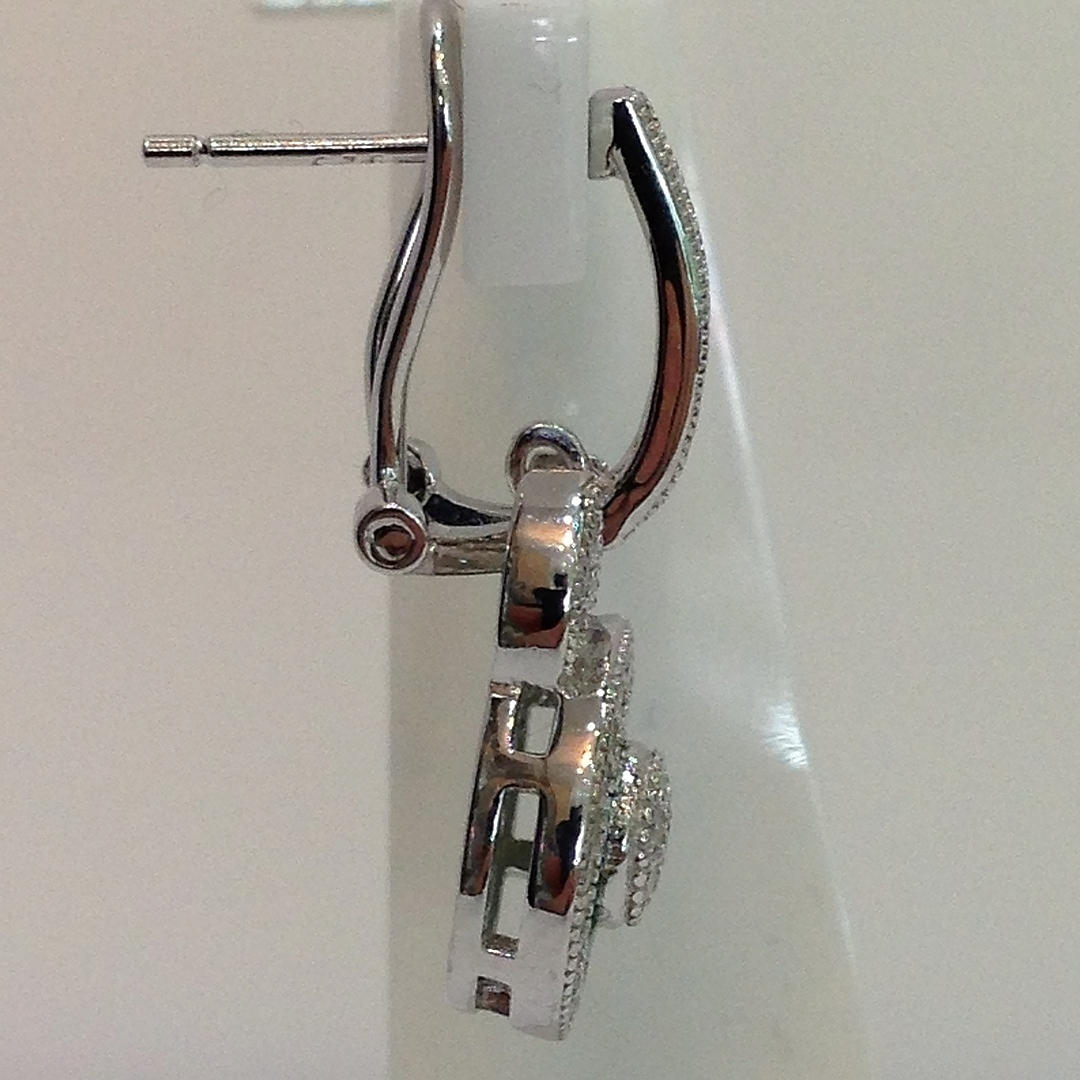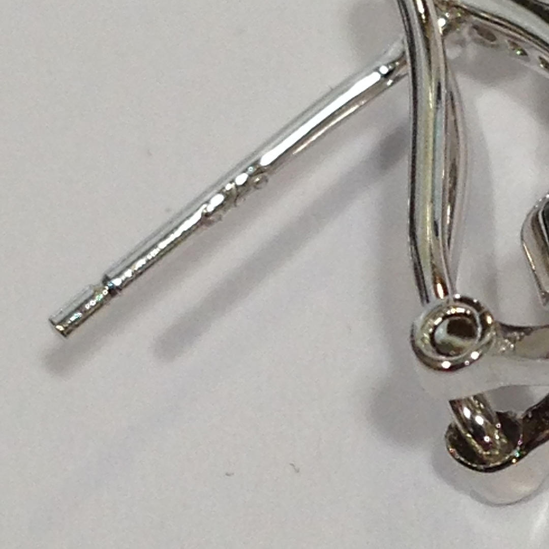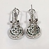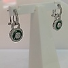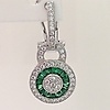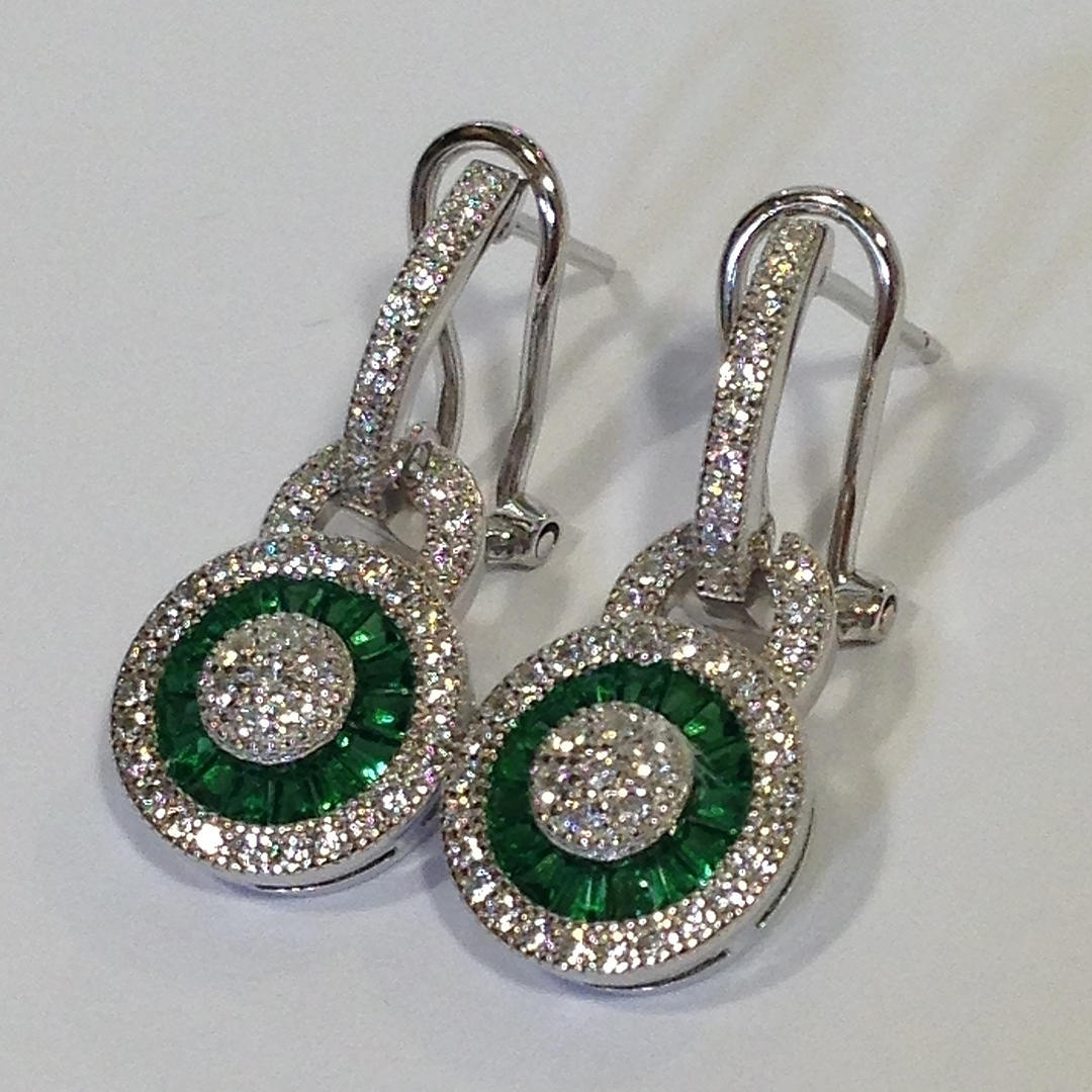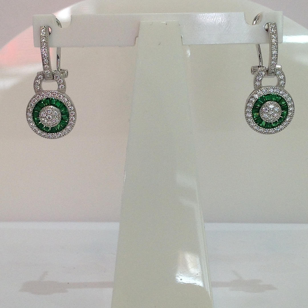 Nämä korvakorut ovat hopeaa (leimattu "925") Näiden korvakorujen keskellä on rypäle valkoisia pyöreitä briljanttileikattuja kuutioisia zirkoniakiviä Tätä kivirypäletä ympäröi patonkileikattujen vihreiden kuutioiden zirkoniakivien sädekehä. On myös toinen sädekehä valkoista pyöreää loistavia leikattuja kuutiometrisiä zirkoniakiviä sinisen halon ympärillä Korvakorujen riipus yhdistyy kuutiozirkoniasarjaan omega-klipsikiinnike Kokonaispaino: 4,4 grammaa.