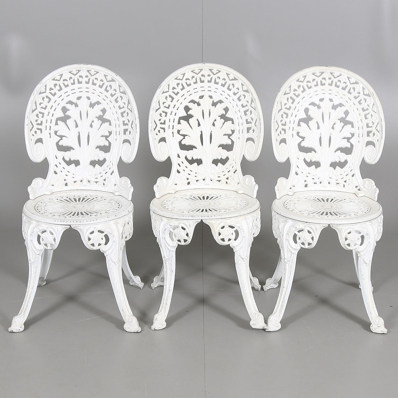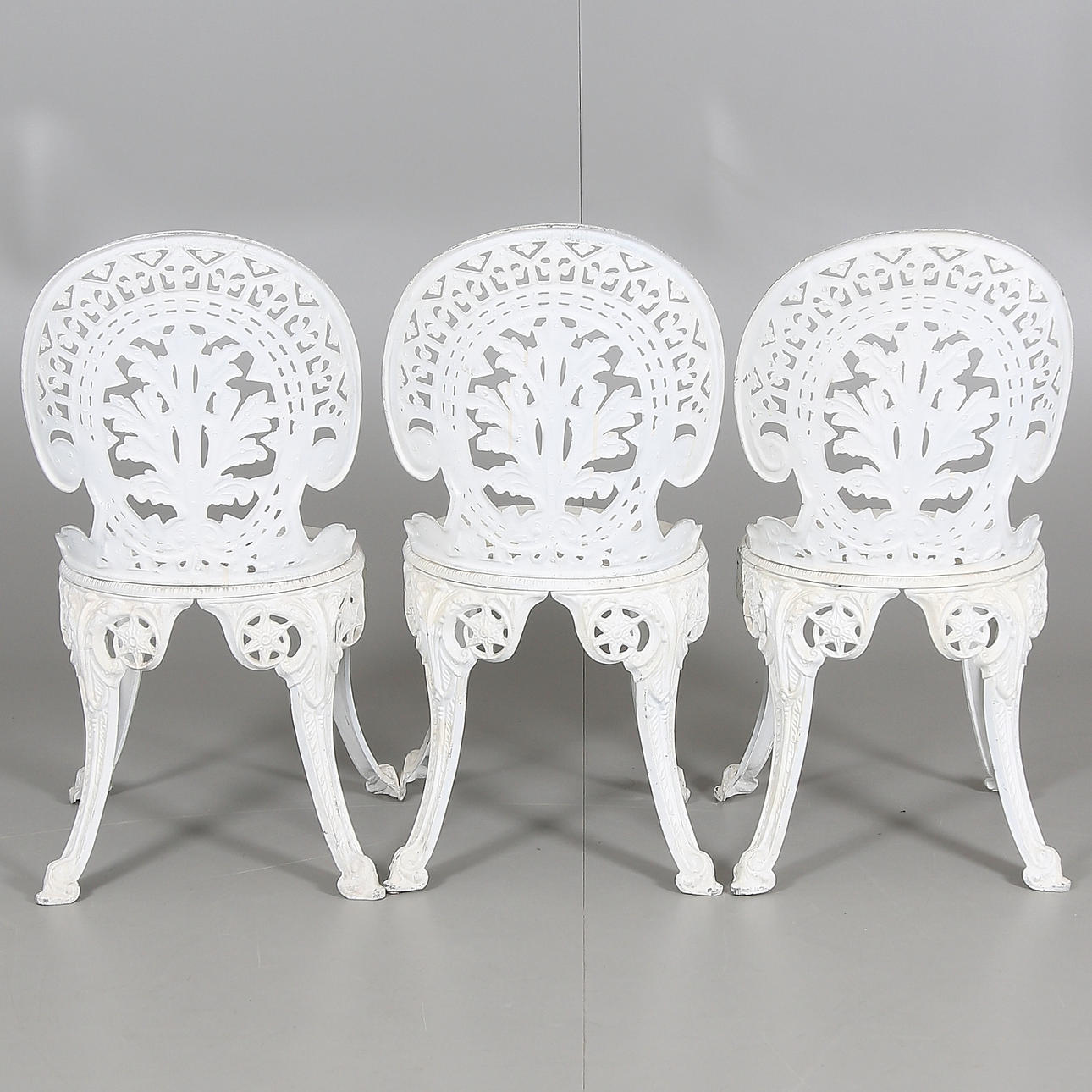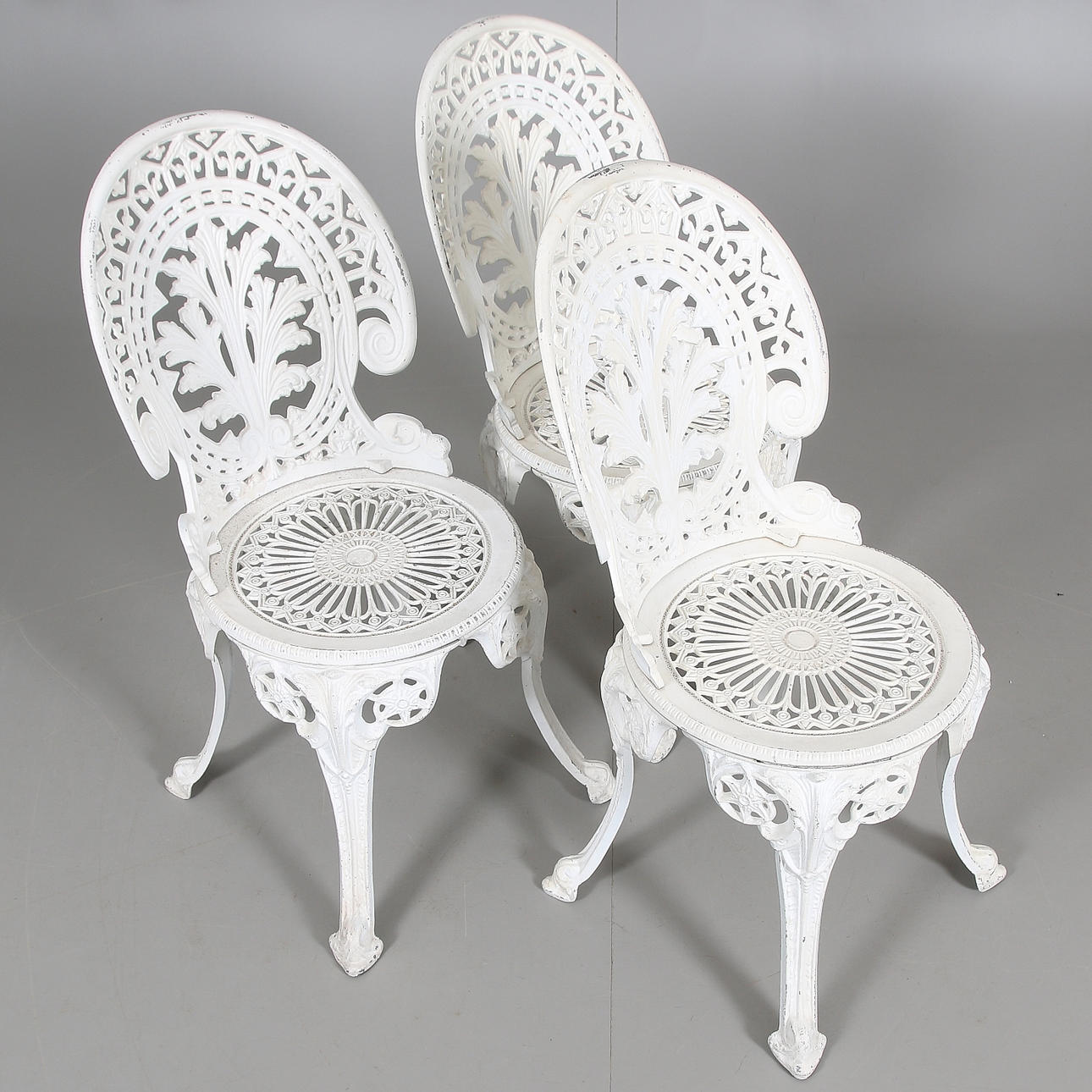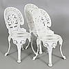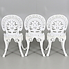 Valkoiseksi maalattua valurautaa. Pituus 46, leveys 45, istuinkorkeus 40, selkänojan korkeus 85 cm.