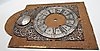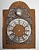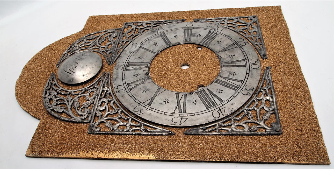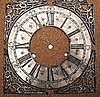 Vanhempi tinasta kellotaulu kiinnitetty kullalla maalatulle puulevylle Kokonaiskorkeus 40 cm, leveys 28 cm.