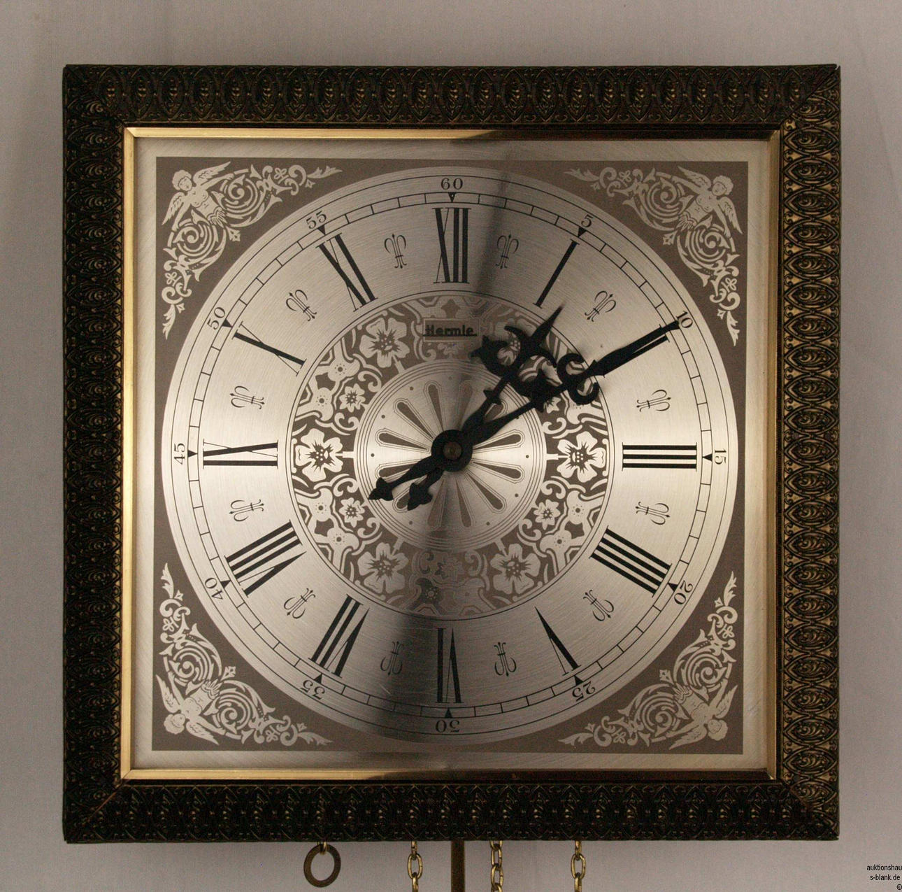 Hermle-seinäkello - suorakaiteen muotoinen puinen kotelo metallilaitteilla, pyöreä metallikellotaulu, suuri roomalainen tunti- ja pienet arabialaiset minuuttinumerot, kaksi osoitinta, kotelo koristeltu kukkakuviolla keskellä ja 4 siivekästä naisalastonkuvaa, joissa koristekuvio kulmissa, KxLxS: n. 25,5x25,5x10 cm, heilurilla ja kahdella painolla, työtä ei vahvistettu.