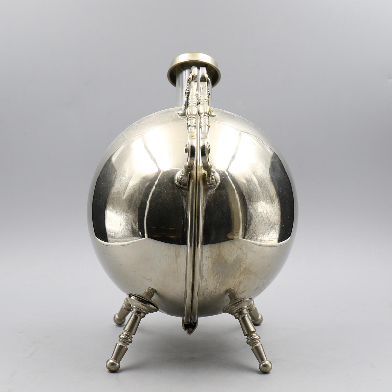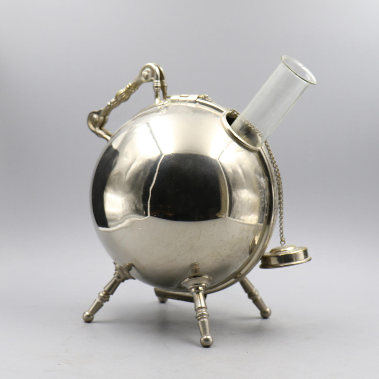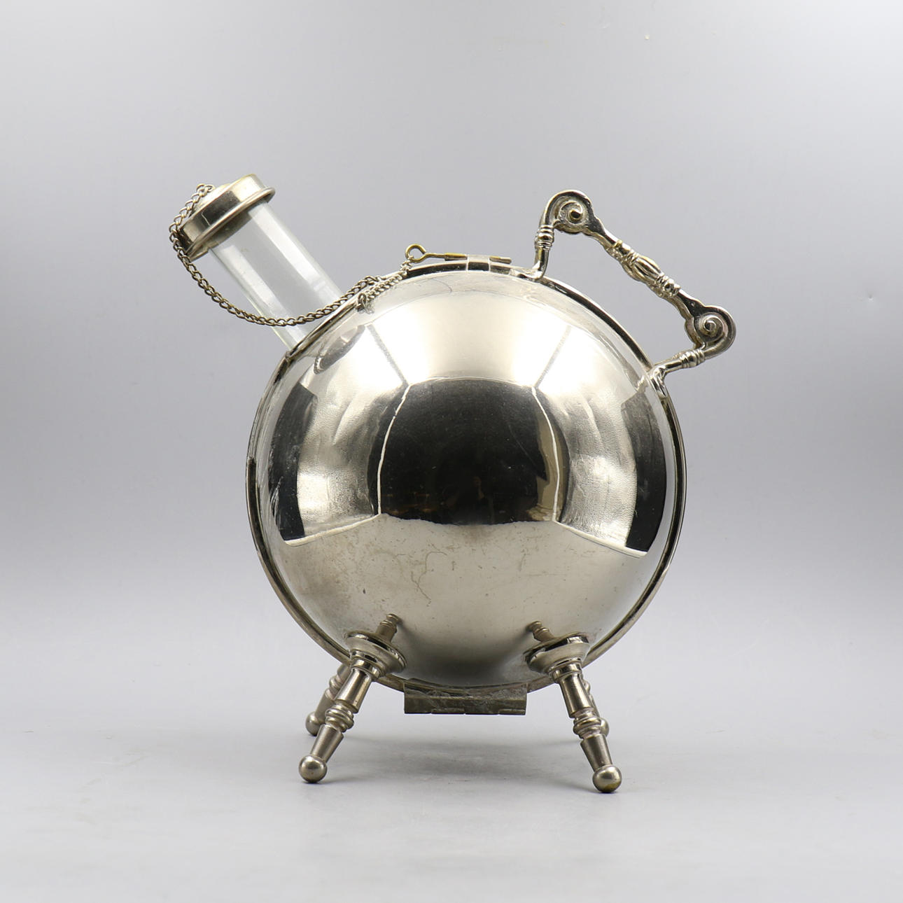 Lasipullo välikappaleena, voi seistä yksinään. Kuori on tehty termostoimintoa varten. Ei näkyvää leimaa, mutta luultavasti uushopea.