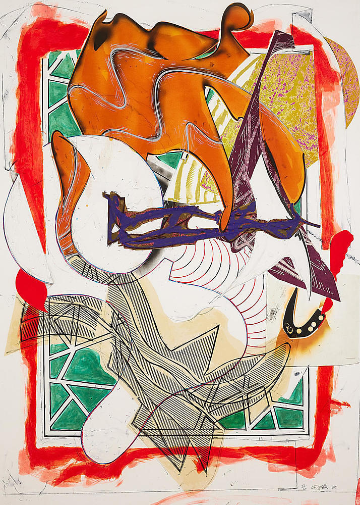 Stella’s early Black Paintings (1958–1960) challenged traditional notions of composition by using simple geometric forms and industrial materials. Over his long career, he explored complex, shaped canvases, vibrant color, and dynamic three-dimensional reliefs, pushing the boundaries between painting and sculpture. Stella’s work is celebrated for its bold visual impact and intellectual rigor.