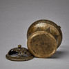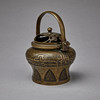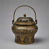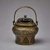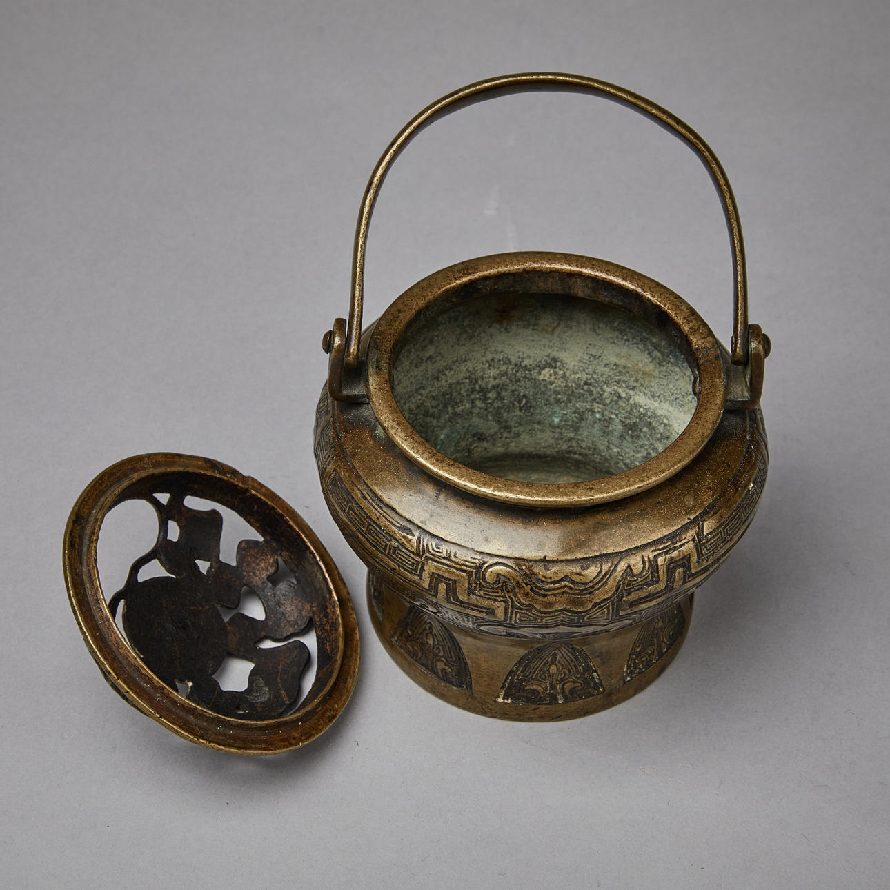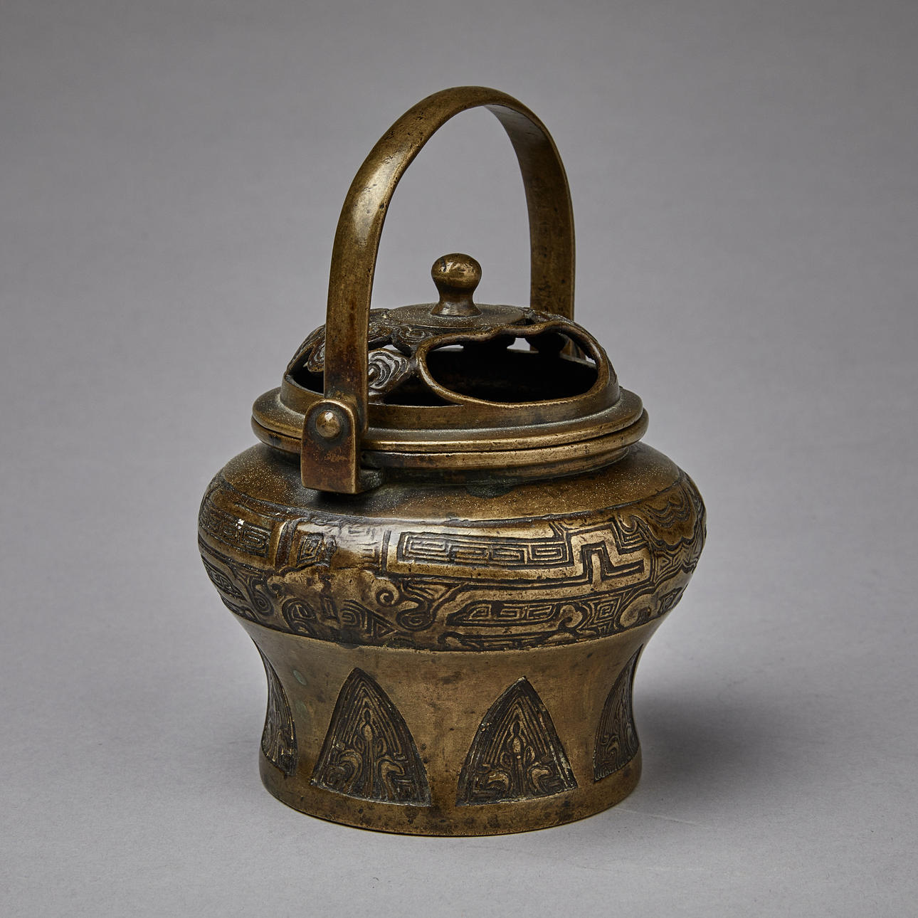 PROnssinen KÄSINLÄMMITIN VERKKOLLISELLA KANSILLA, ämpäri koristeltu arkaaistisella geometrisella kuviolla, kansi pilvikääröillä, 1600-luku, korkeus n. 15 cm.