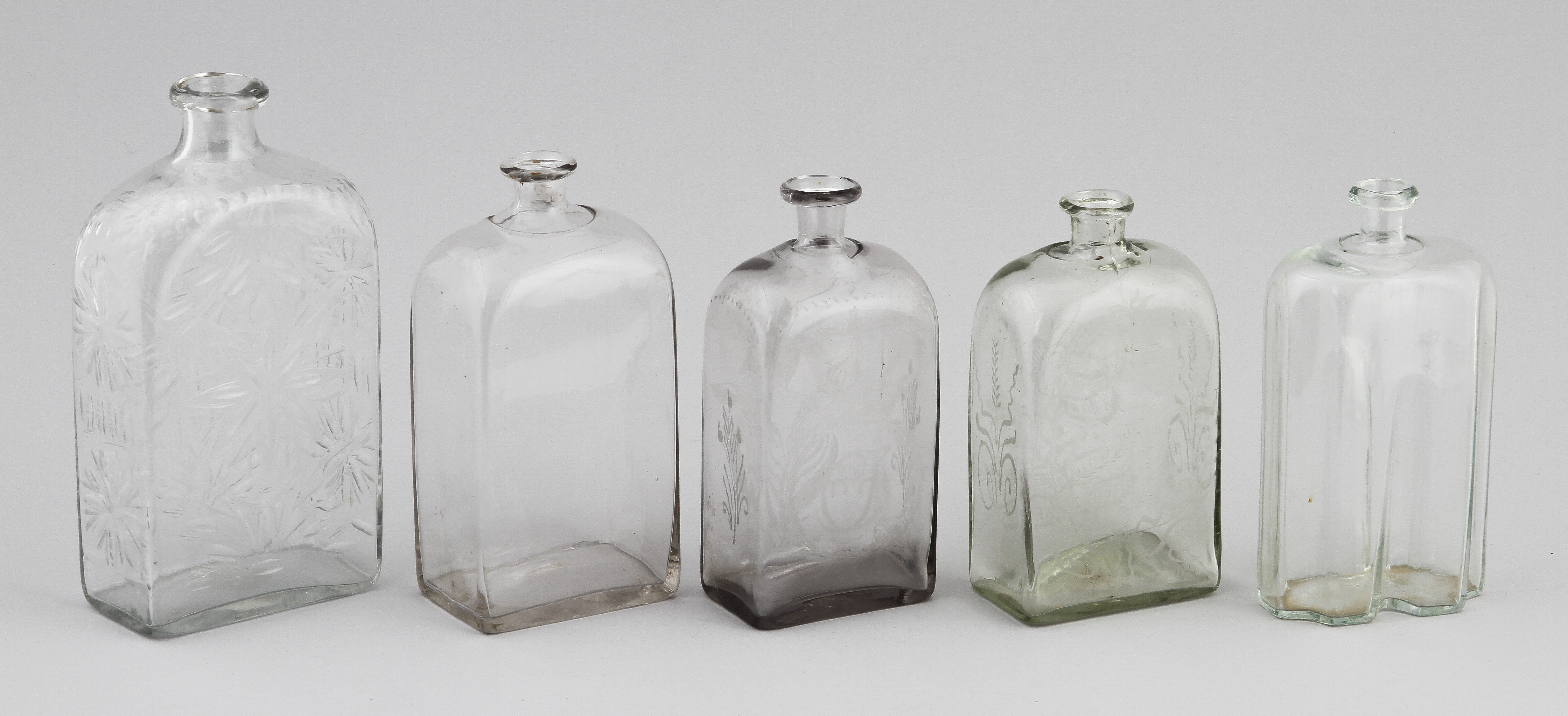 100664. BRÄNNVINSFLASKOR, 5 st, glas, 1800-tal.