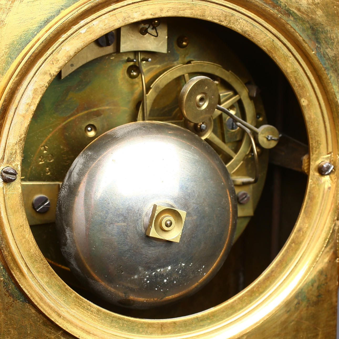 Slitage, smärre fläckar, urtavla med repor. Dekordel något lös. Nyckel samt pendel saknas. Dekorelement med spricka.