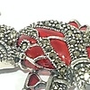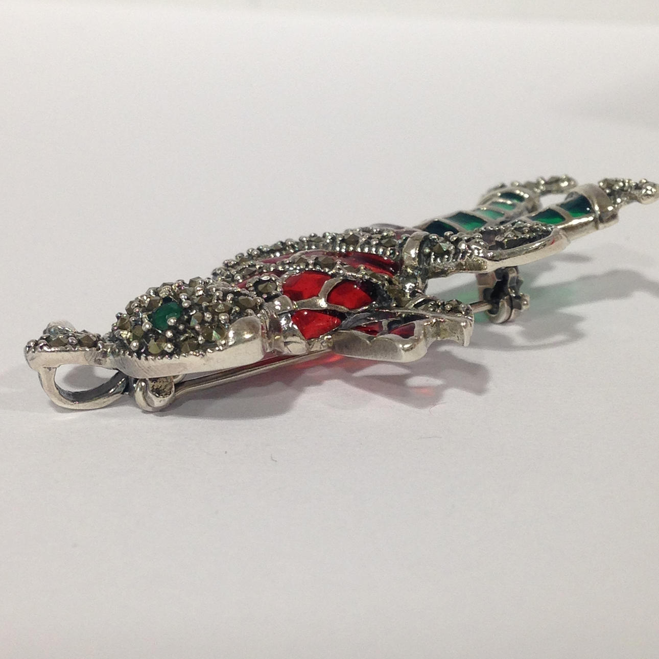 Broschen är inställd med röd och grön emalj och markasit stenar.
