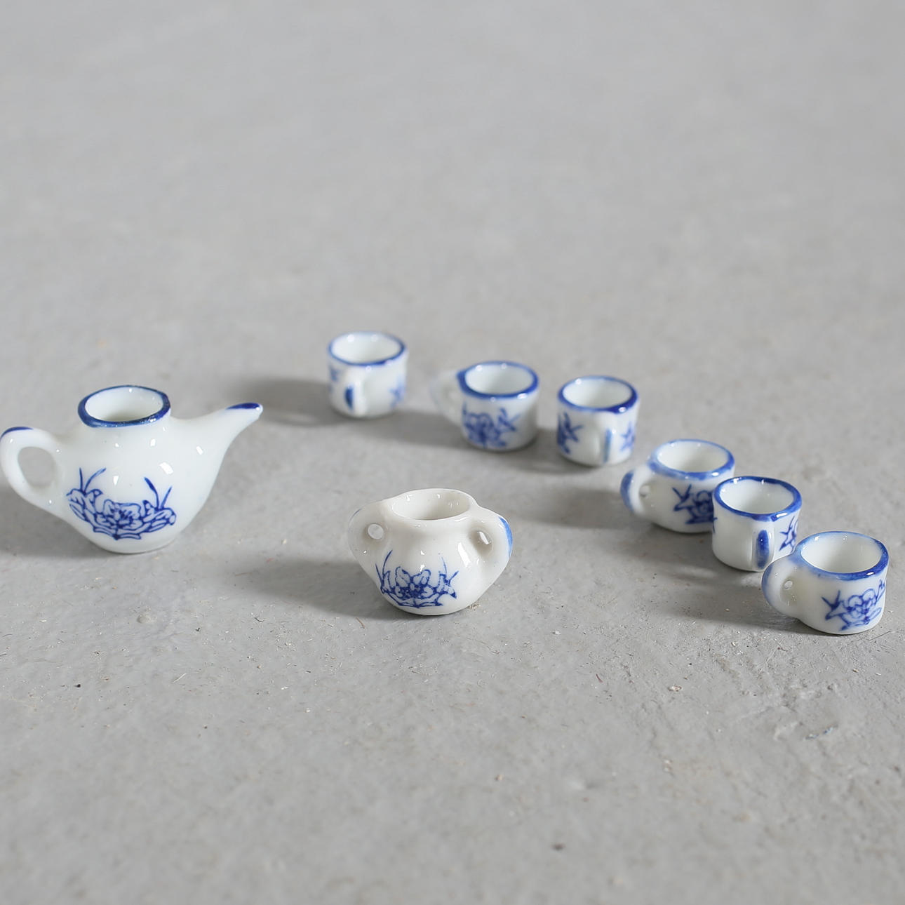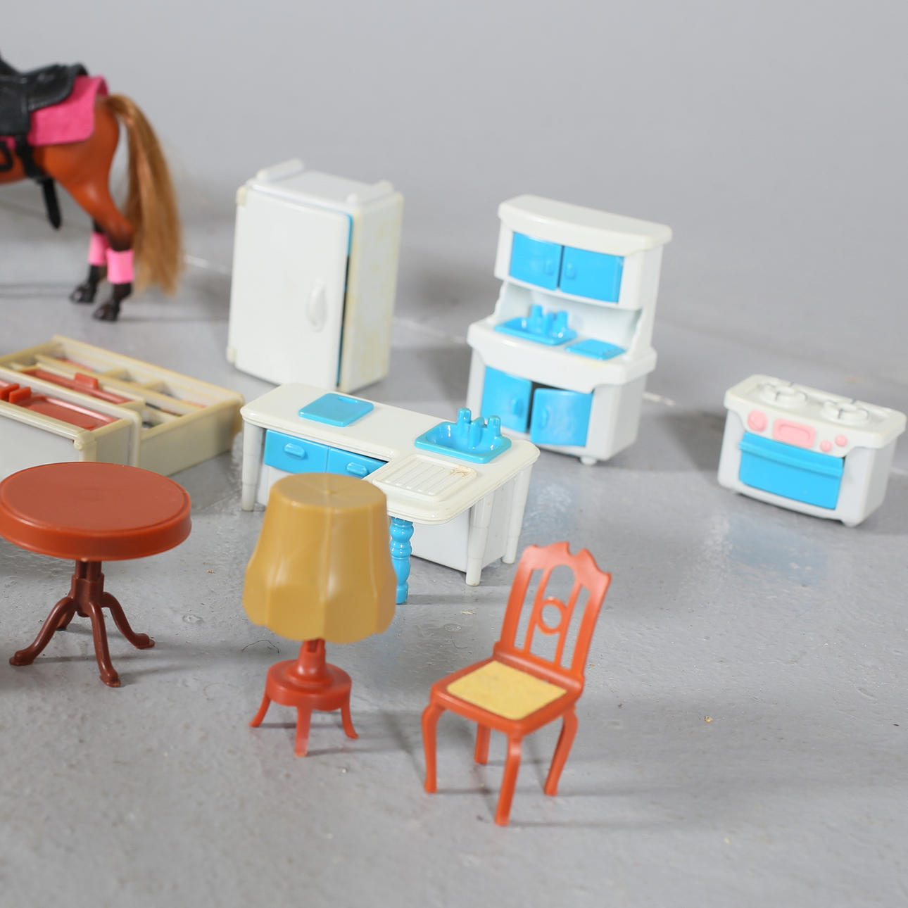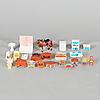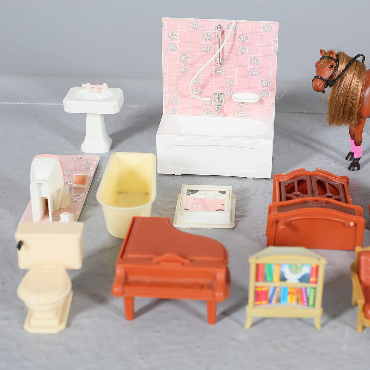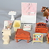 Porslinsservis, notställ, flygel, badkar, spis, hyllor, bokhyllor köksskåp, fåtöljer, kylskåp, spegel, golvlampa, pallar, kastruller, kaffepanna, strykbräda, mm.