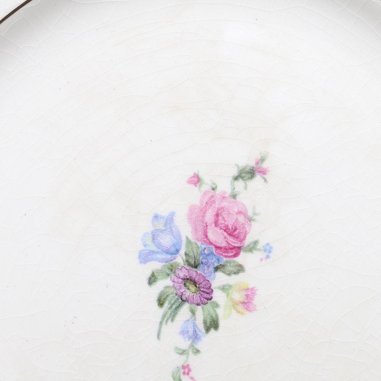 Några ålderskrackeleringar i glasyr förekommer på fem tallrikar, och två assietter har färgförändringar.