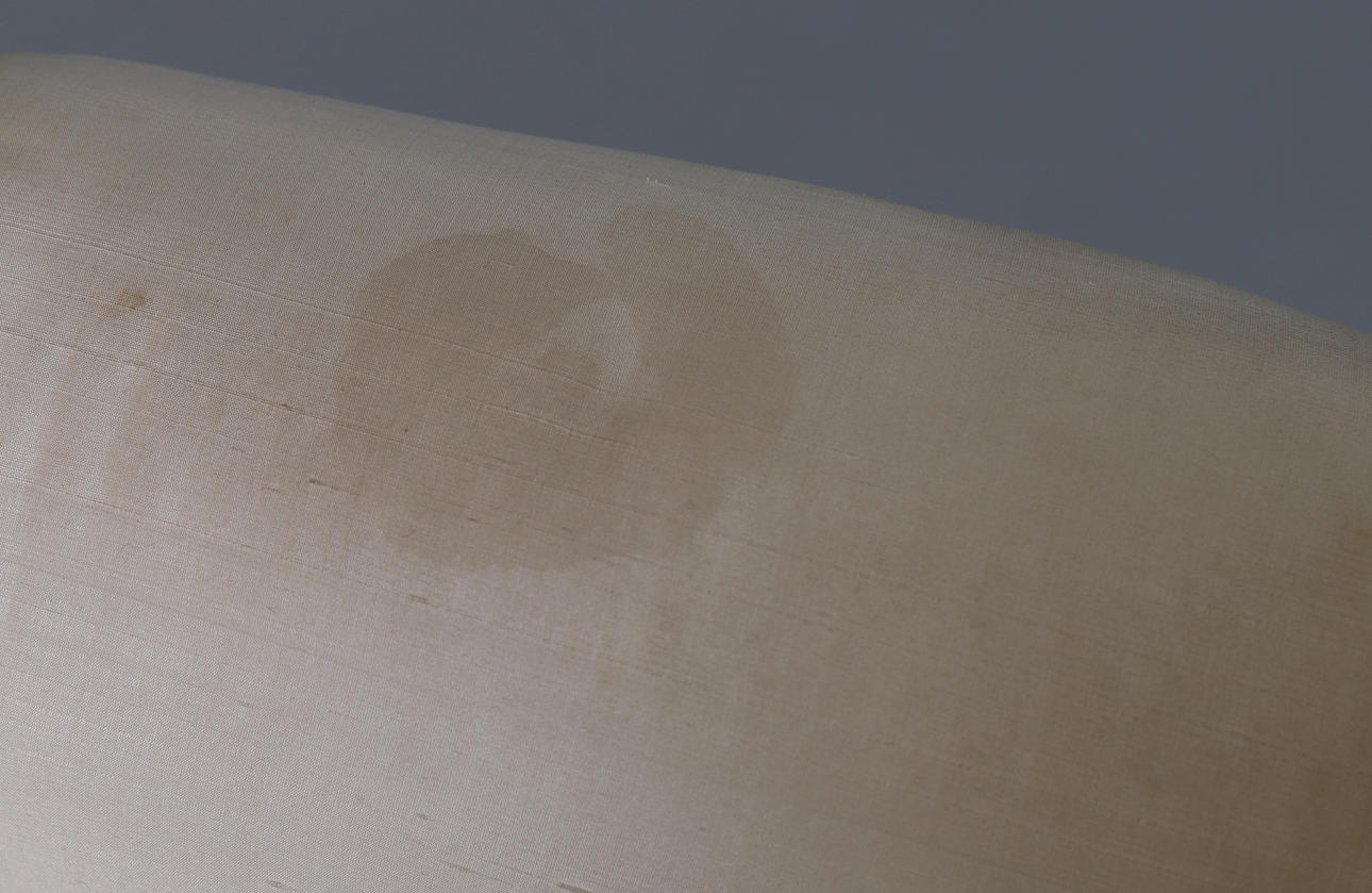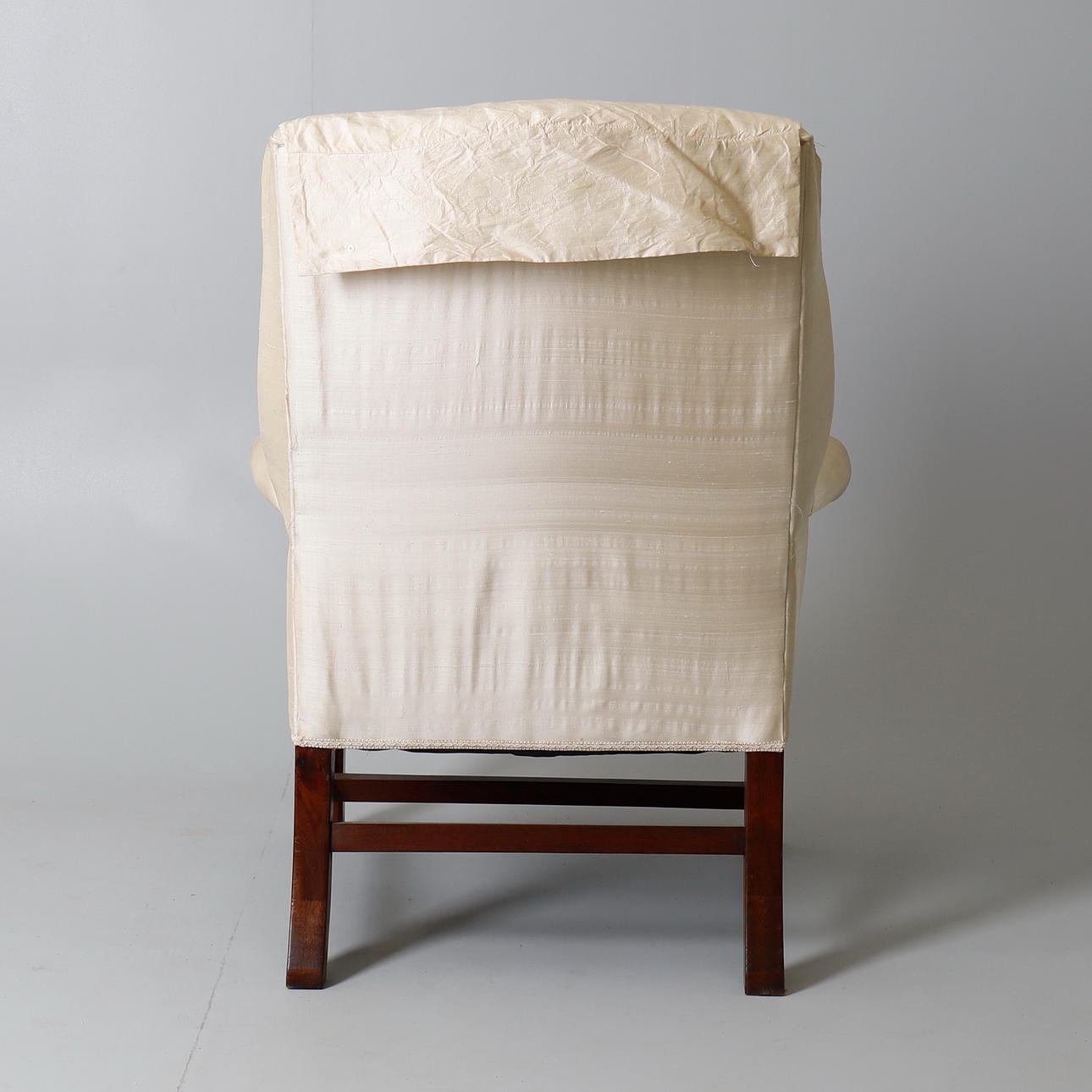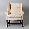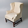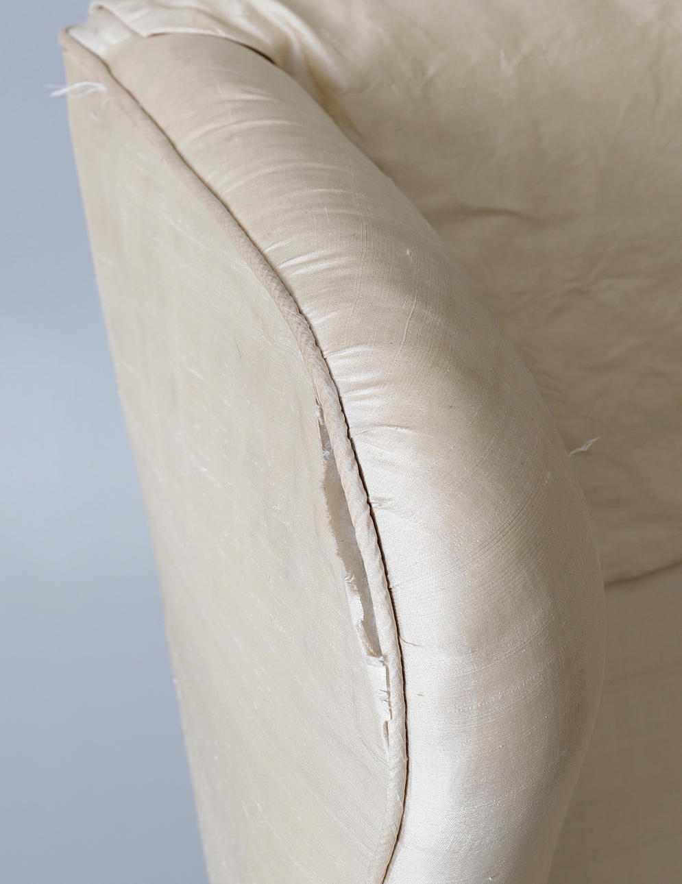 Klädd stoppad sits. 107 cm hög, 86 cm bred, ca. 68 cm djup.