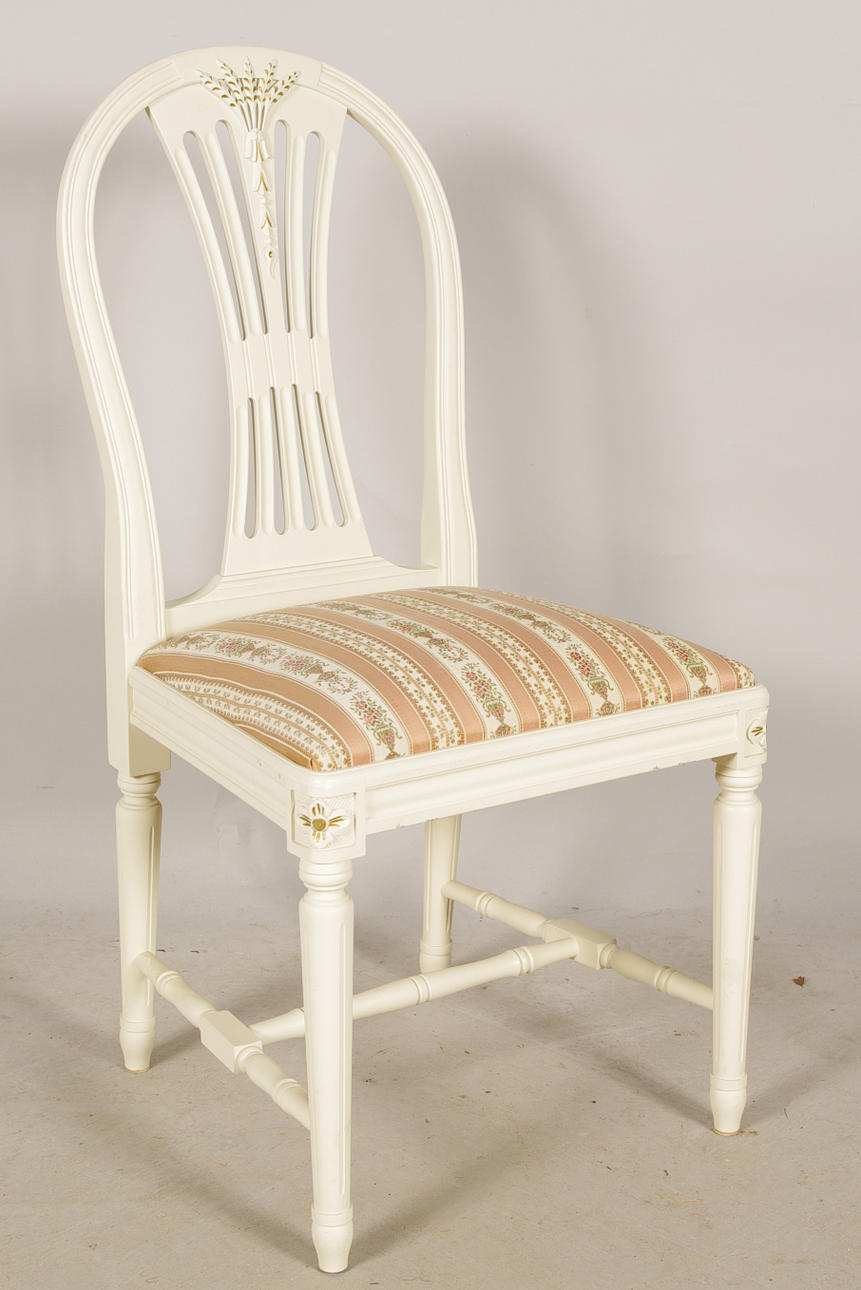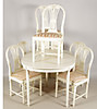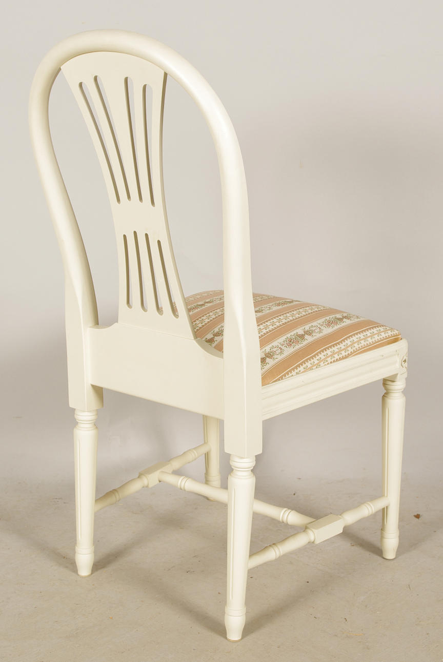 bord, 6 stolar, 2 skivor, bordets höjd 73, längd 150, bredd 95, skivornas bredd 30 cm.