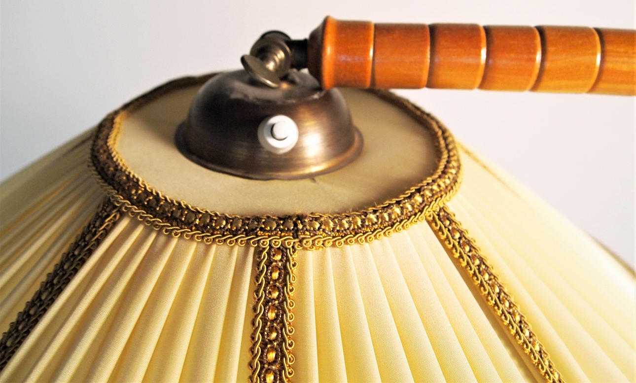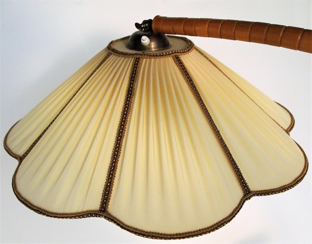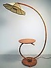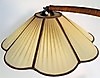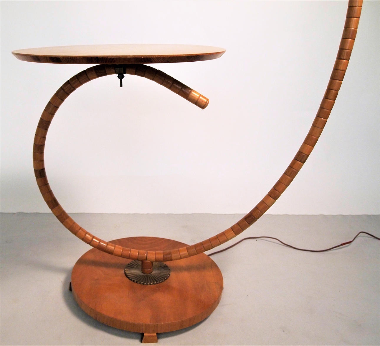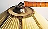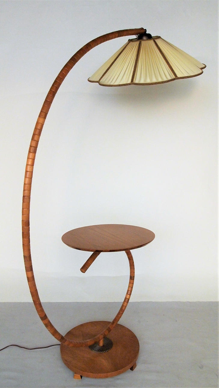 Golvlampa med böjd trästång, golvplatta och bordsskiva i trä, skärm i plisserat tyg. Höjd 160 cm, dia bordsskiva 45 cm.