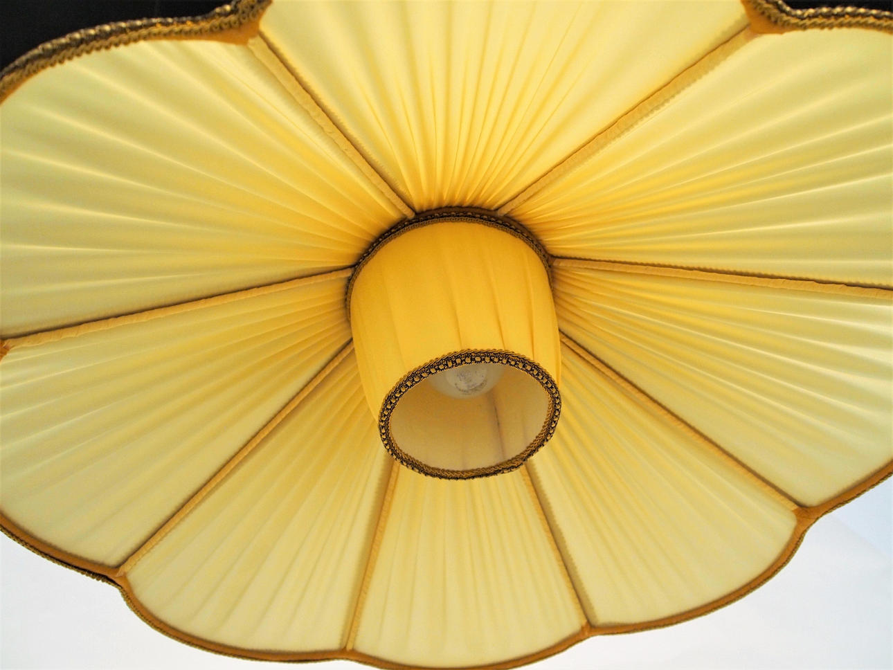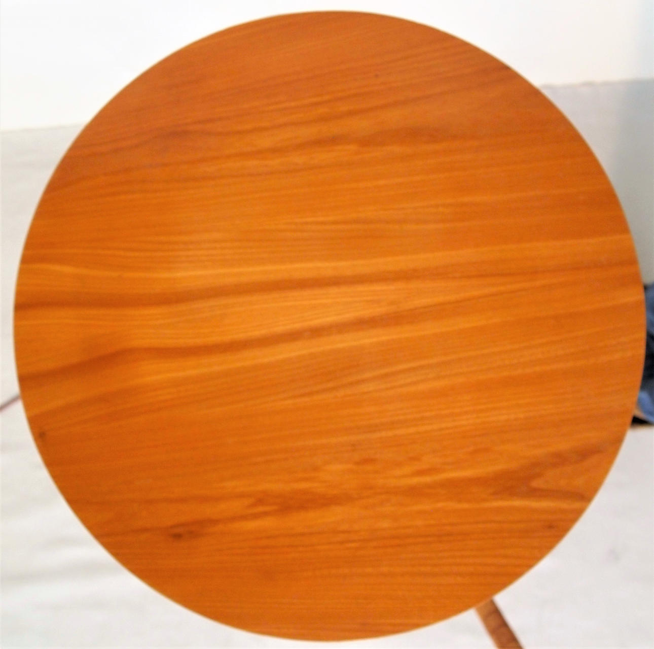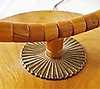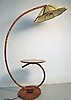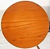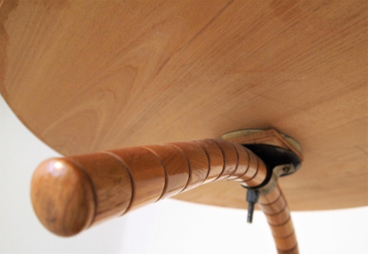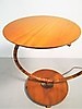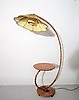 Golvlampa med böjd trästång, golvplatta och bordsskiva i trä, skärm i plisserat tyg. Höjd 160 cm, dia bordsskiva 45 cm.