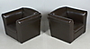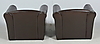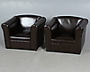 Fräcka fåtöljer i mörkbrunt skinn, sitt höjd 25, rygghöjd 48, bredd 60, djup 50 centimeter.