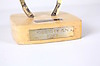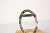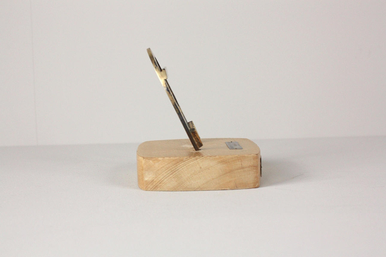 Skulptur av hästsko i metall på träplatta 17 cm hög, 15 cm bredd.