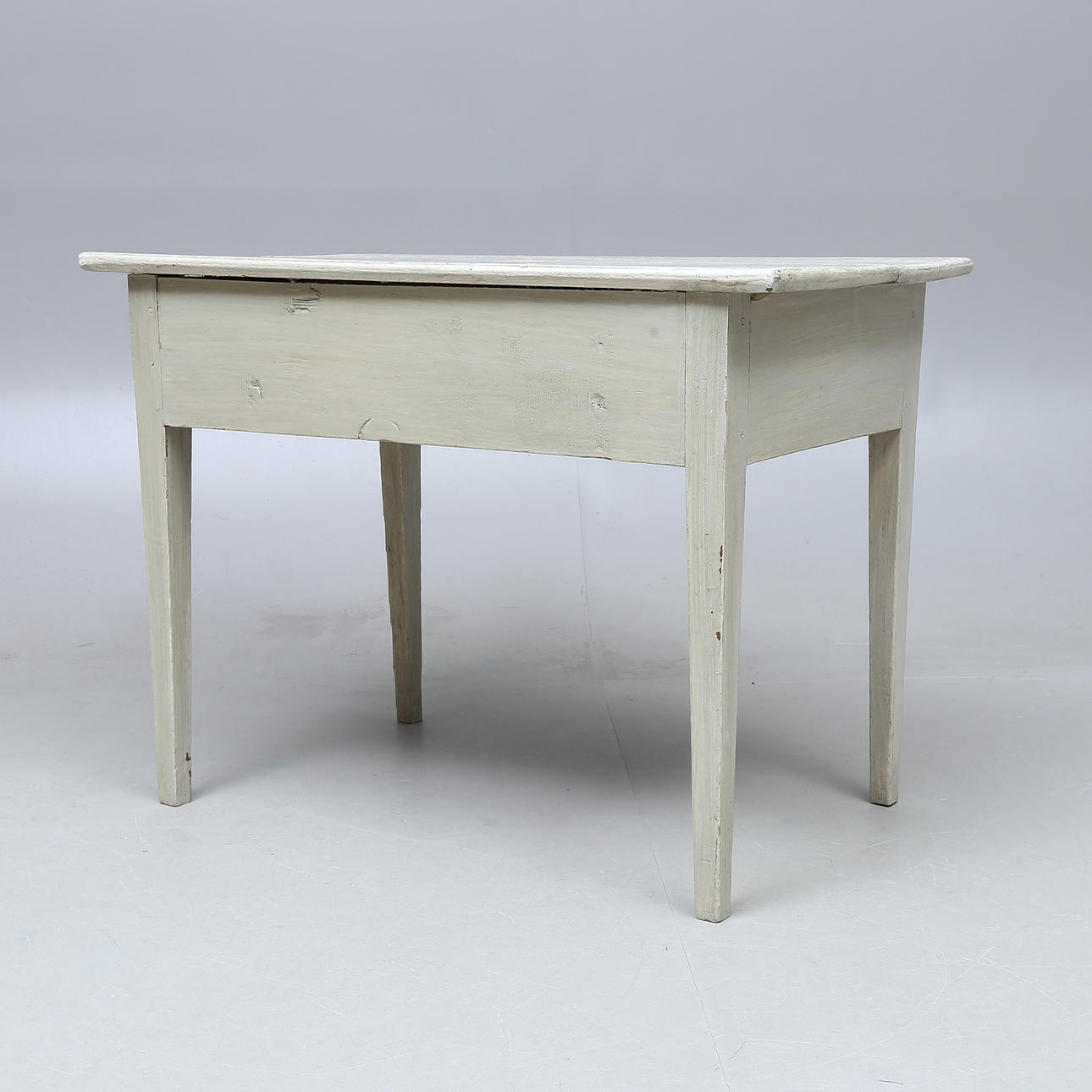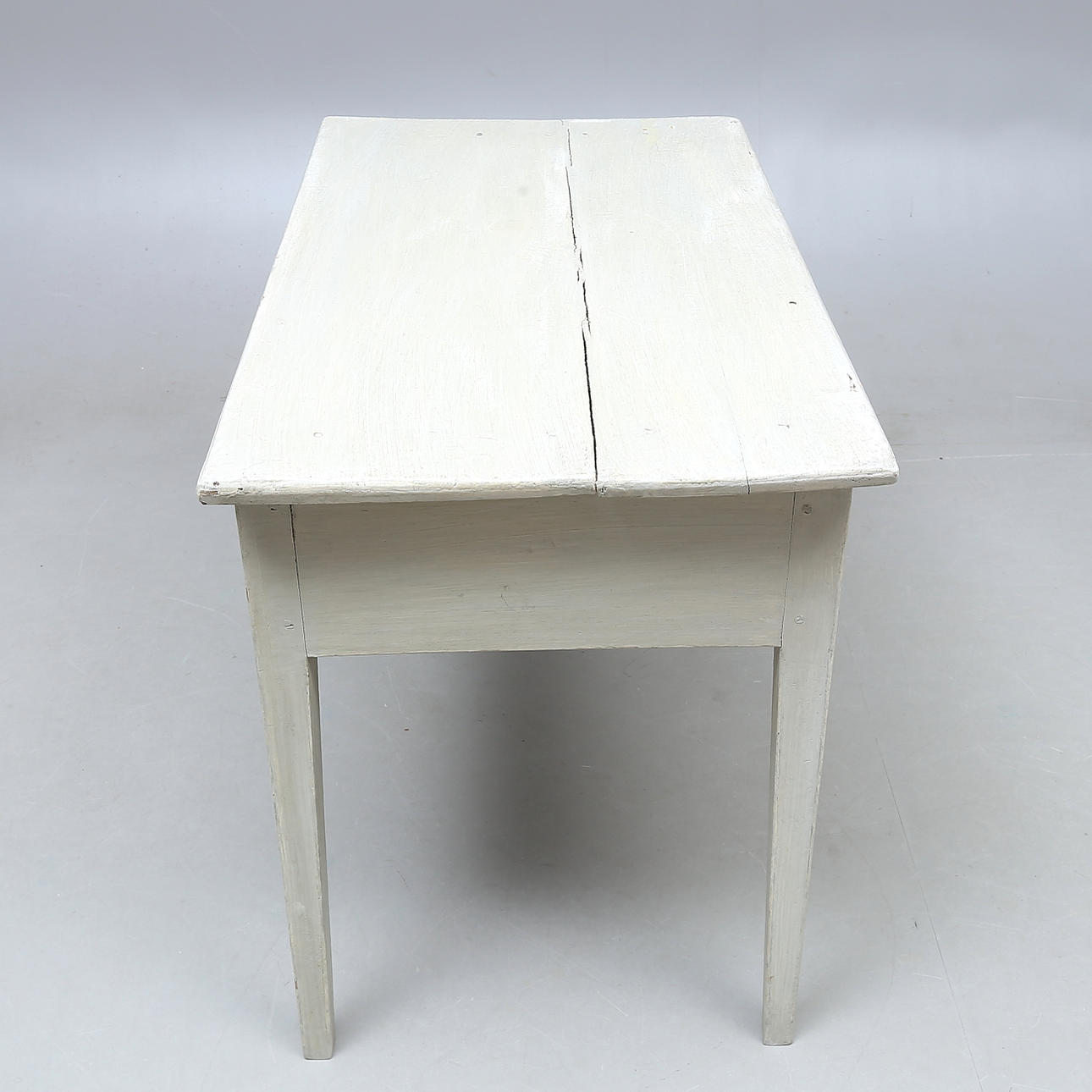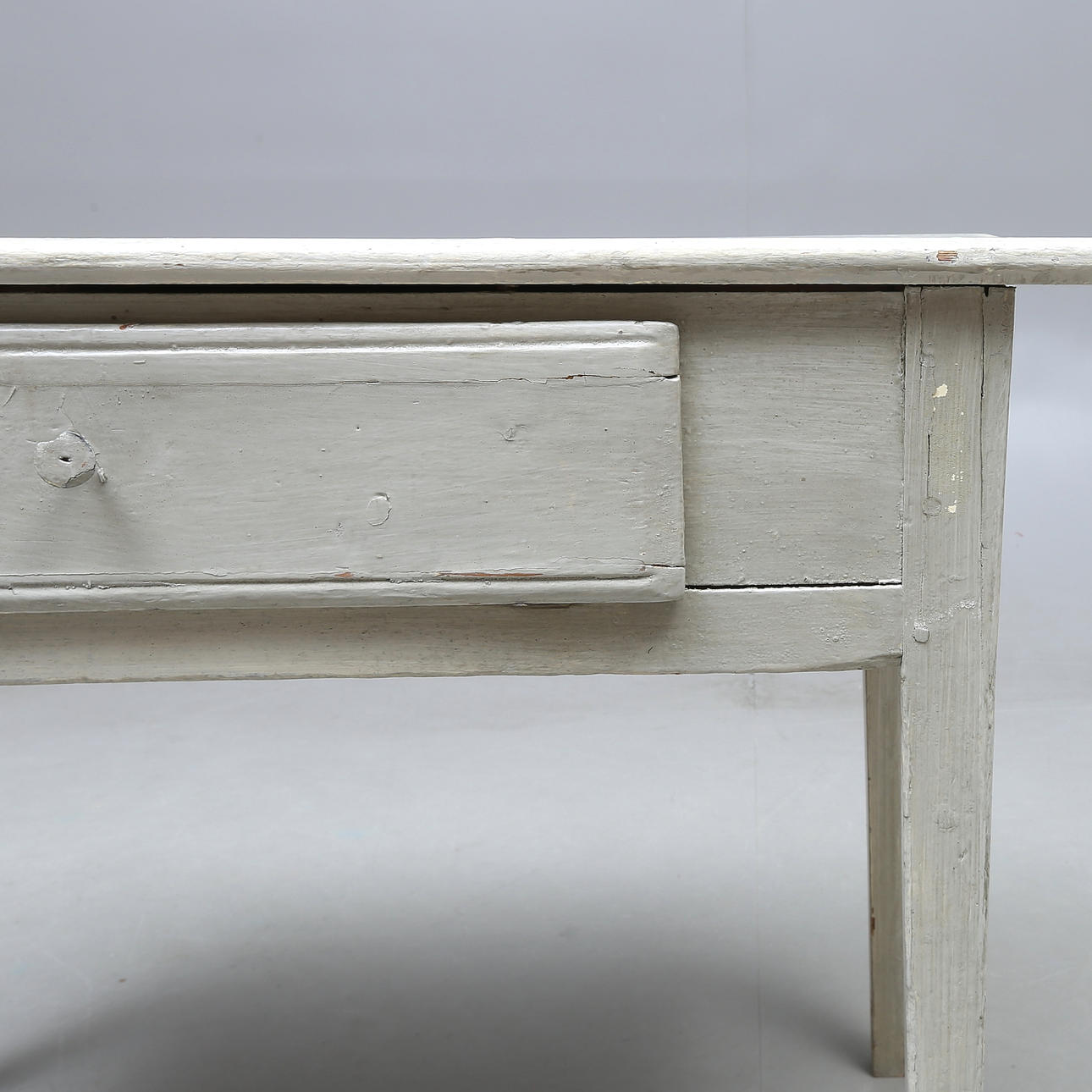 Slitage, torrsprickor, sprickor. Senare knopp på låda. Senare bemålning med färgbortfall.