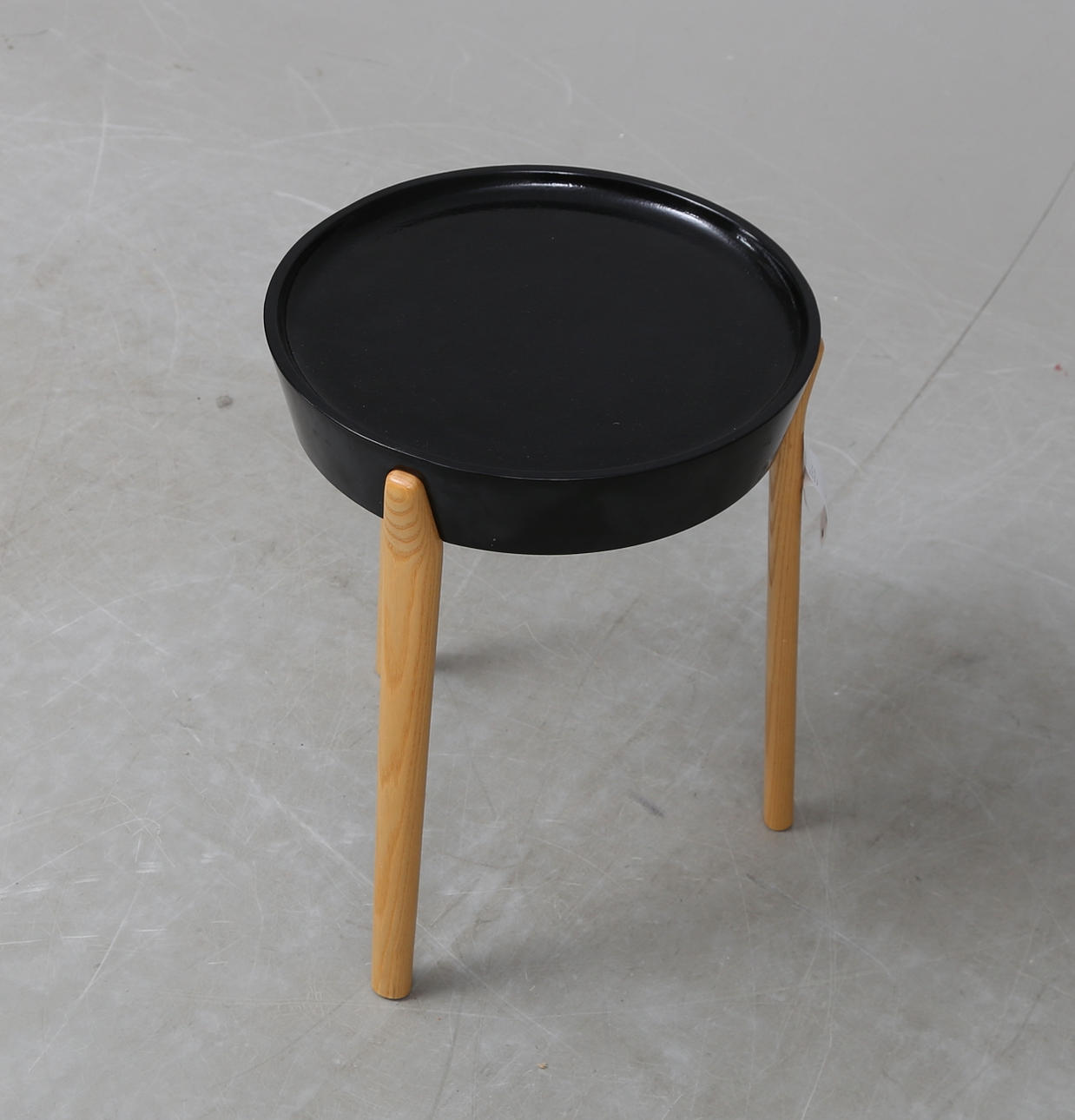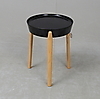 Skiva, lackerad aluminium. Ben av ek. Diameter ca. 35, höjd 45 cm.
