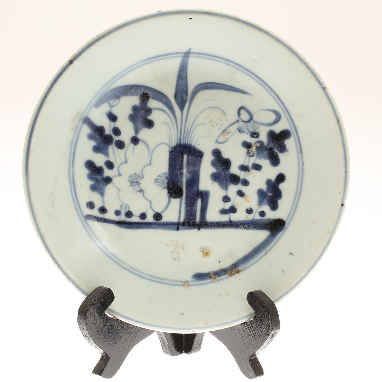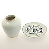 Höjd vas cirka 15 cm. Diameter fat cirka 18 cm, höjd cirka 2,5 cm.