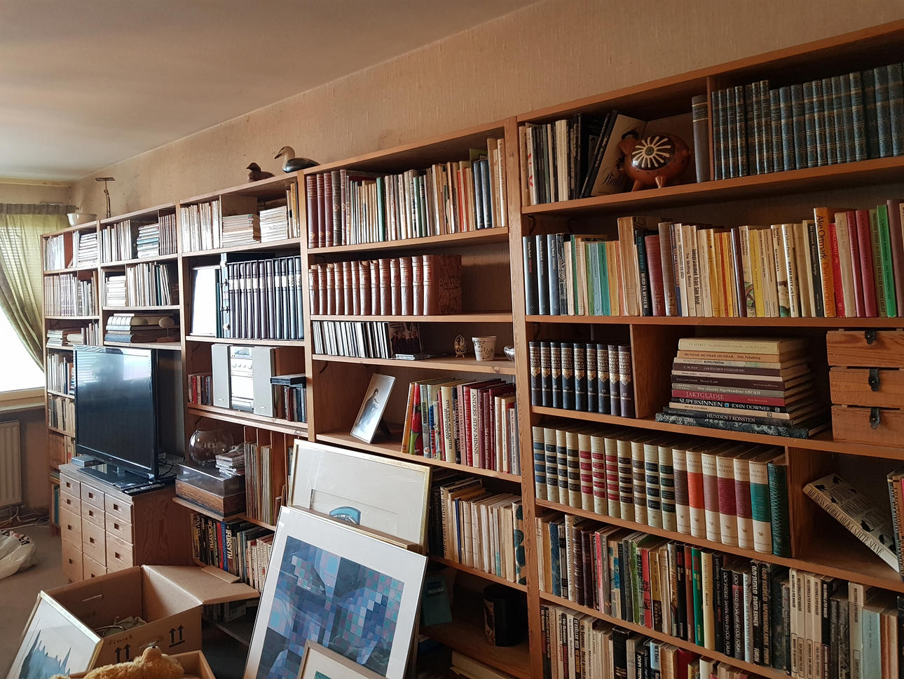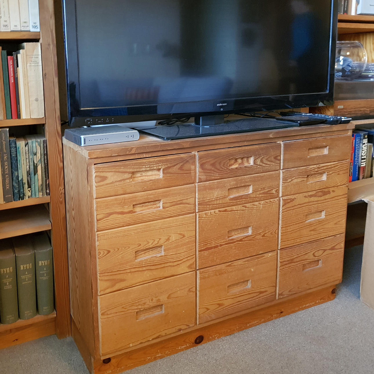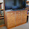 Hyllsystem med sex sektioner och två lådmoduler, varje lådmodul med sex större och sex mindre lådor.