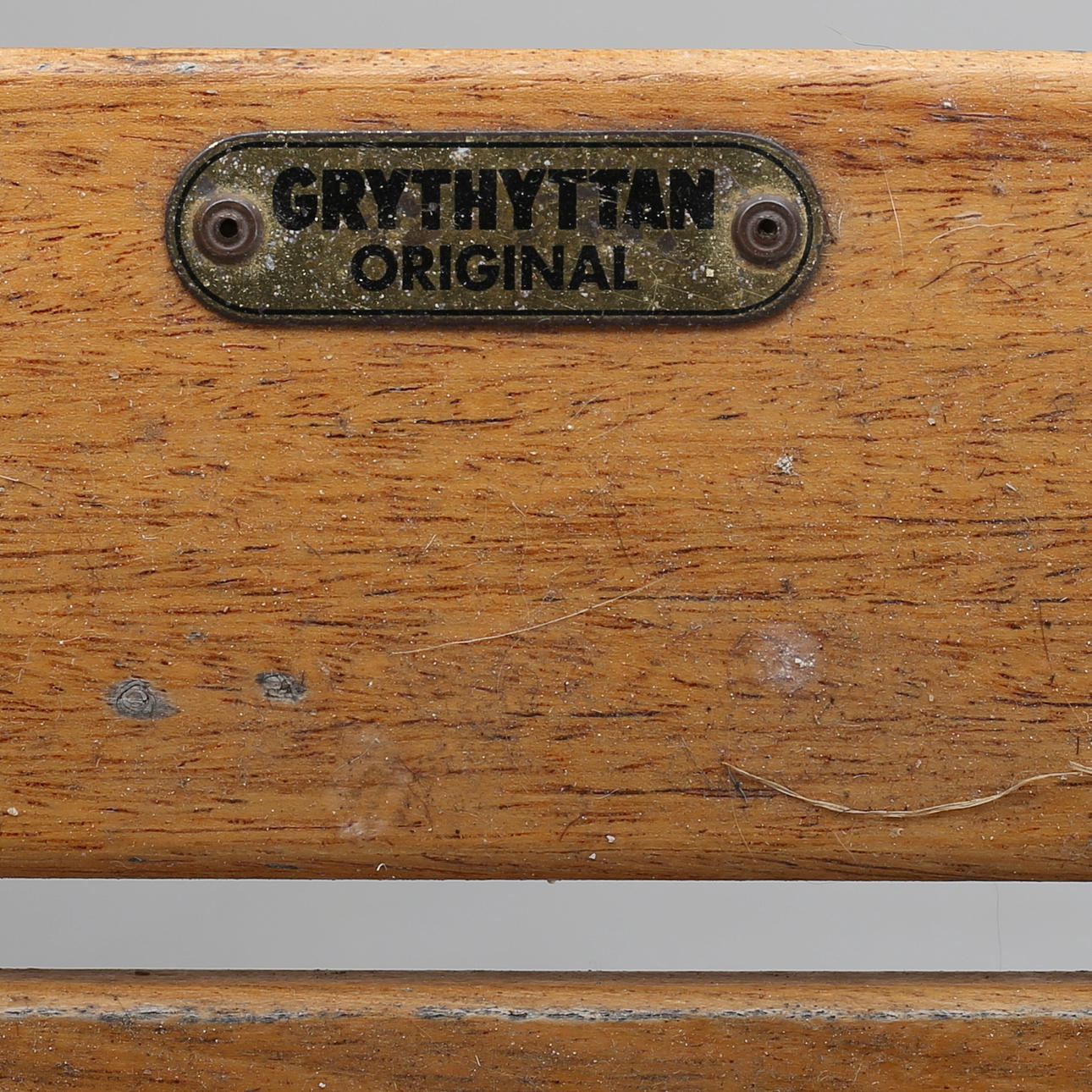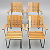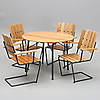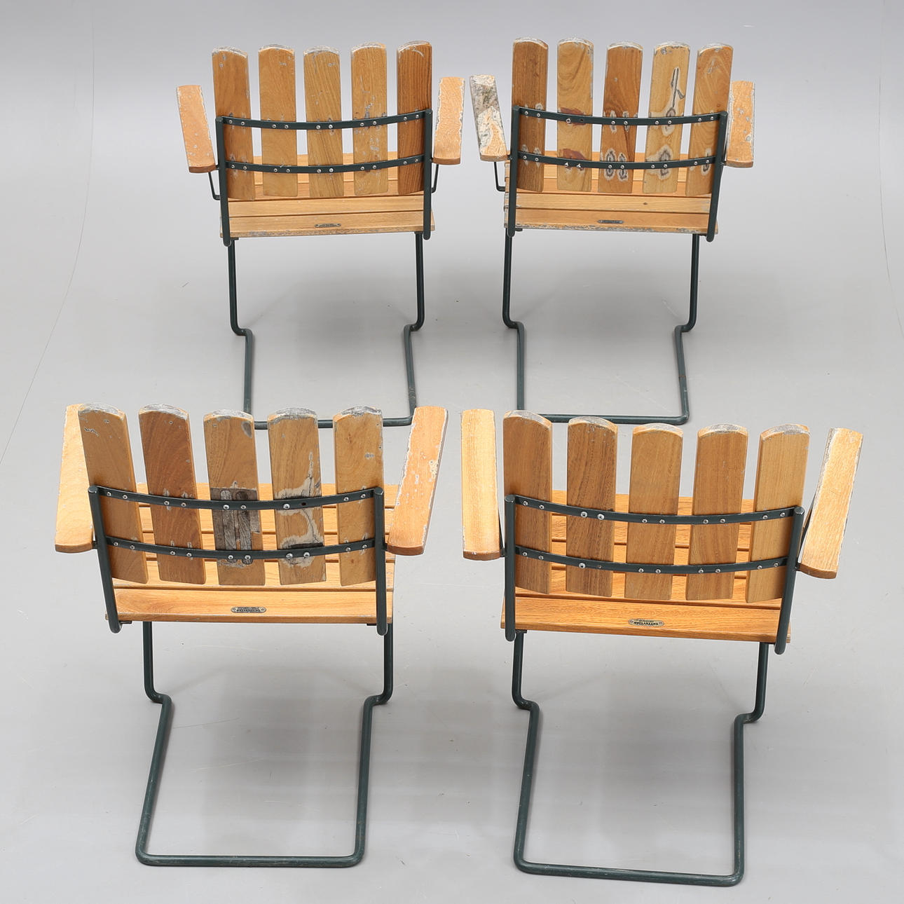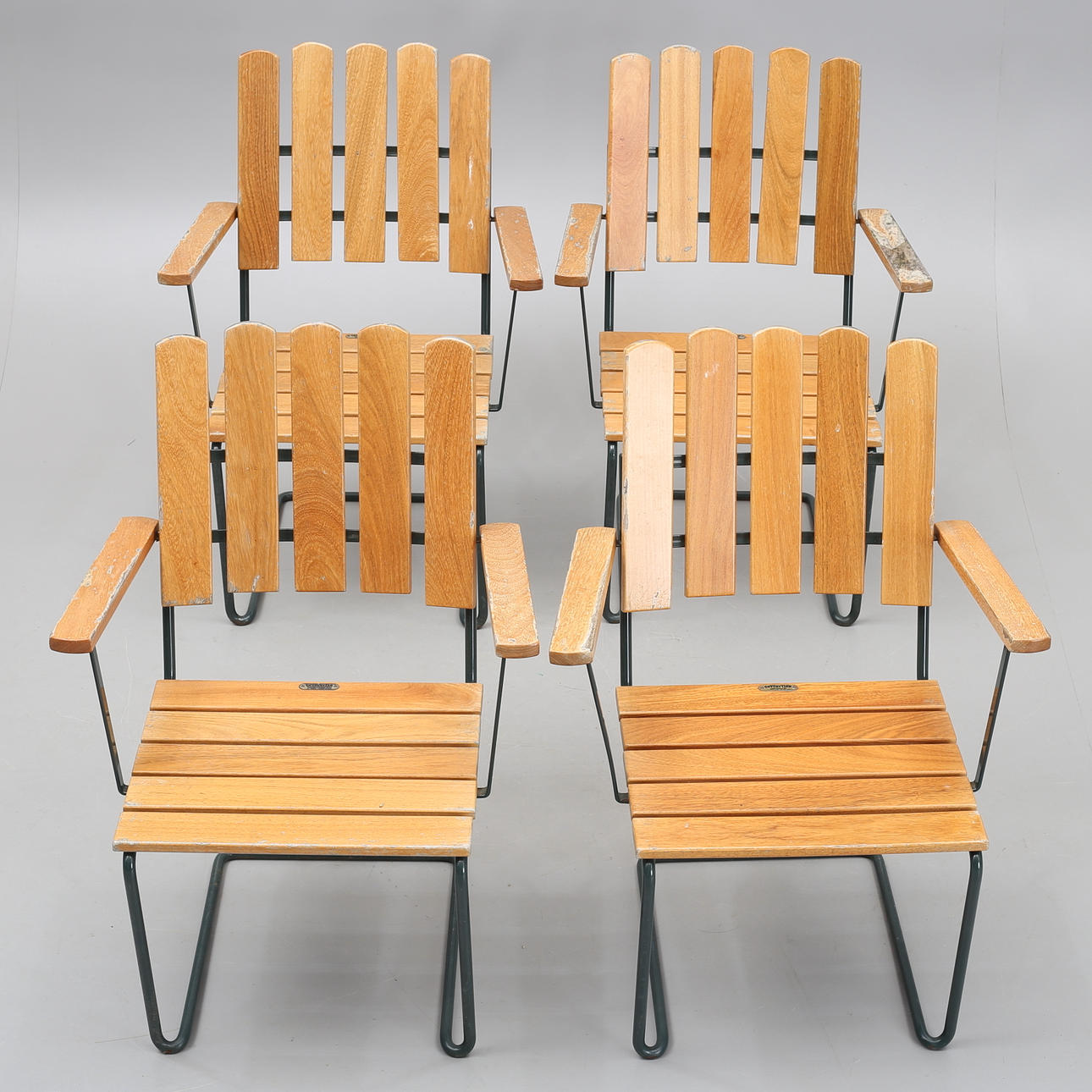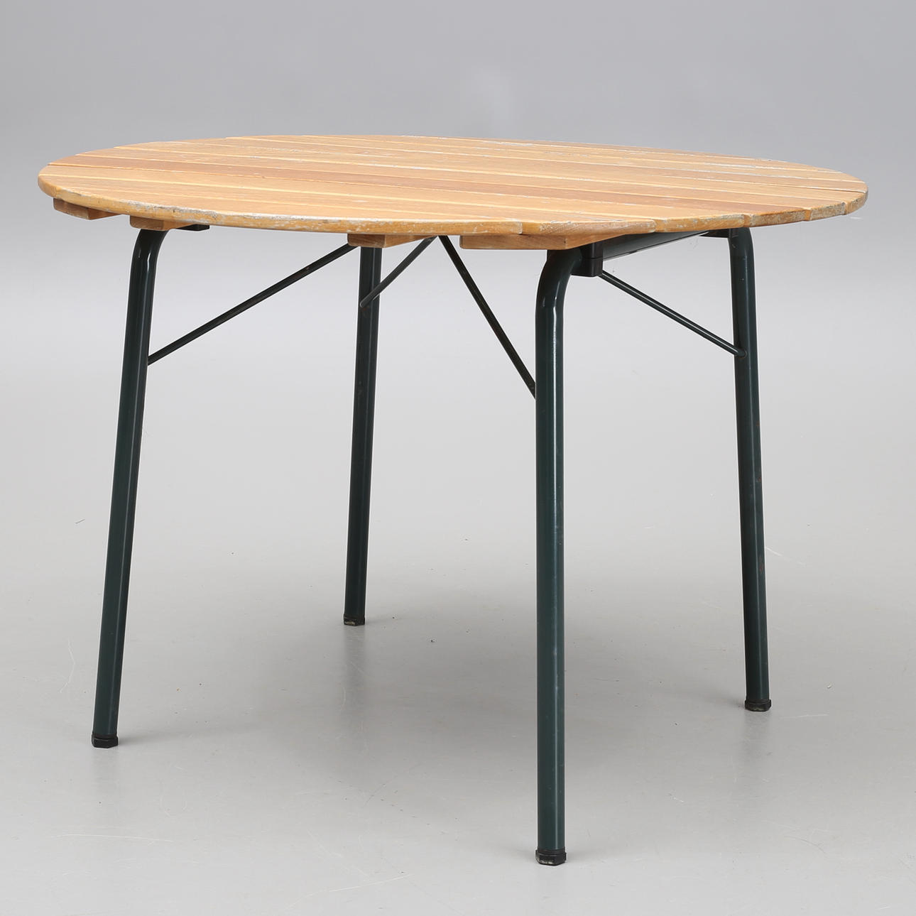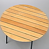 Brickmärkta. Hopfällbart bord höjd 71, diameter 100 cm. 4 karmstolar rygghöjd 85 cm.
