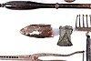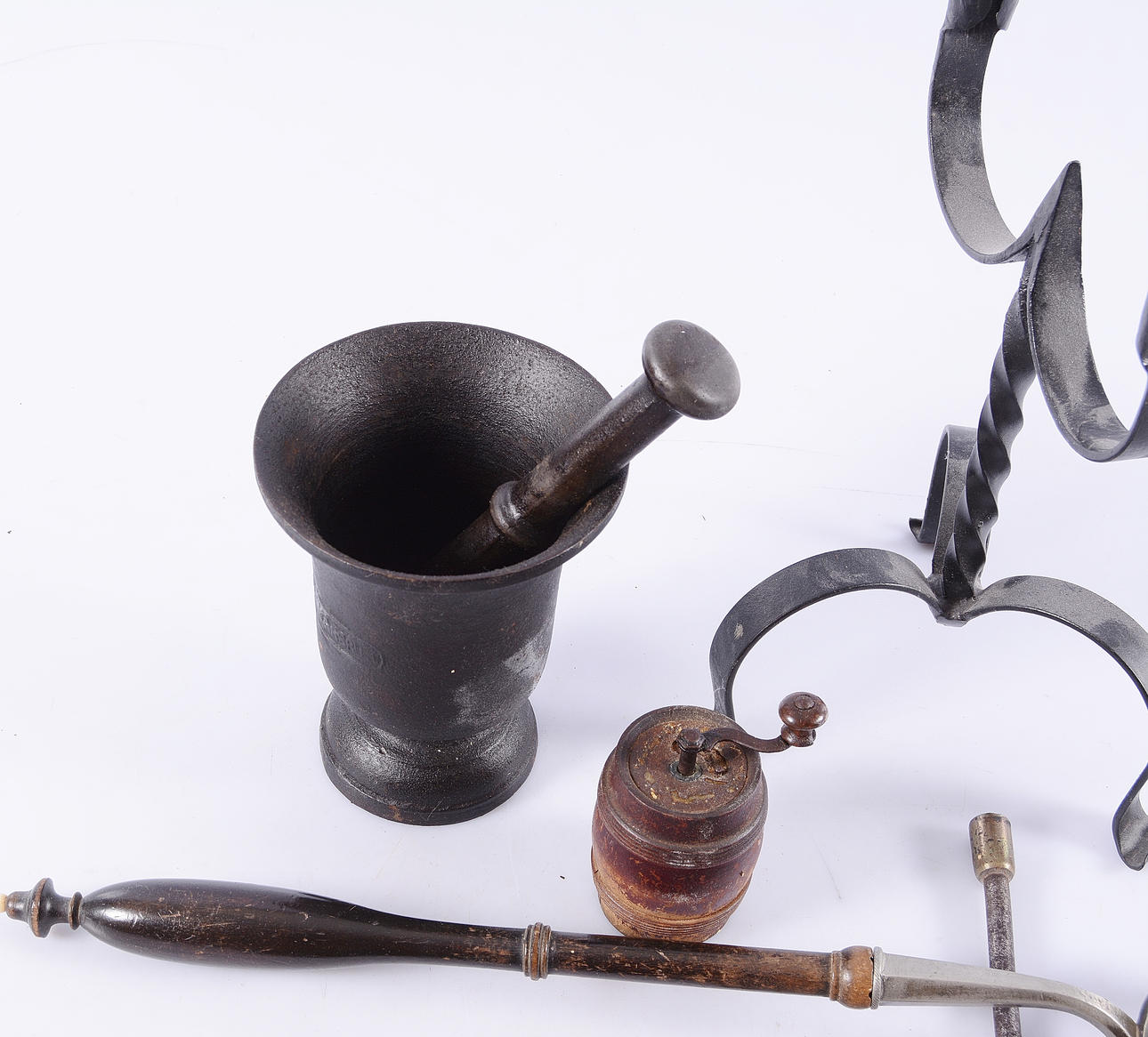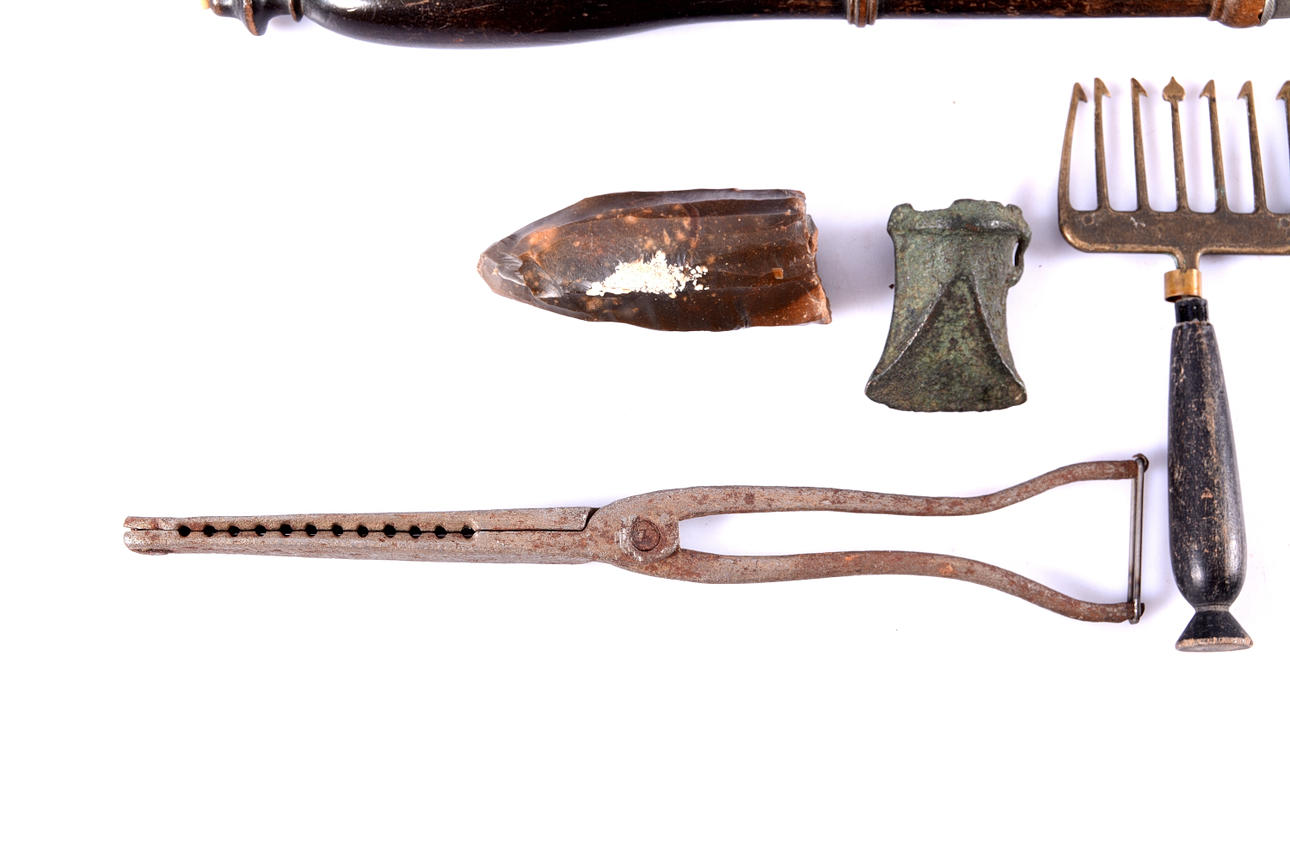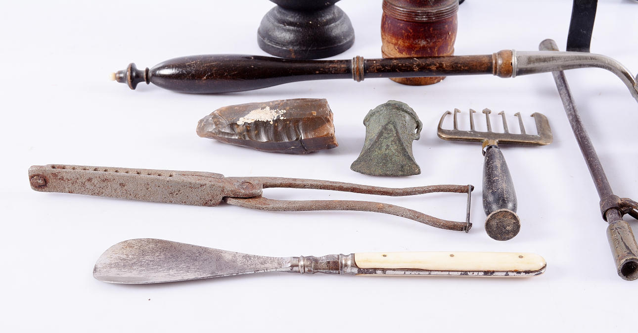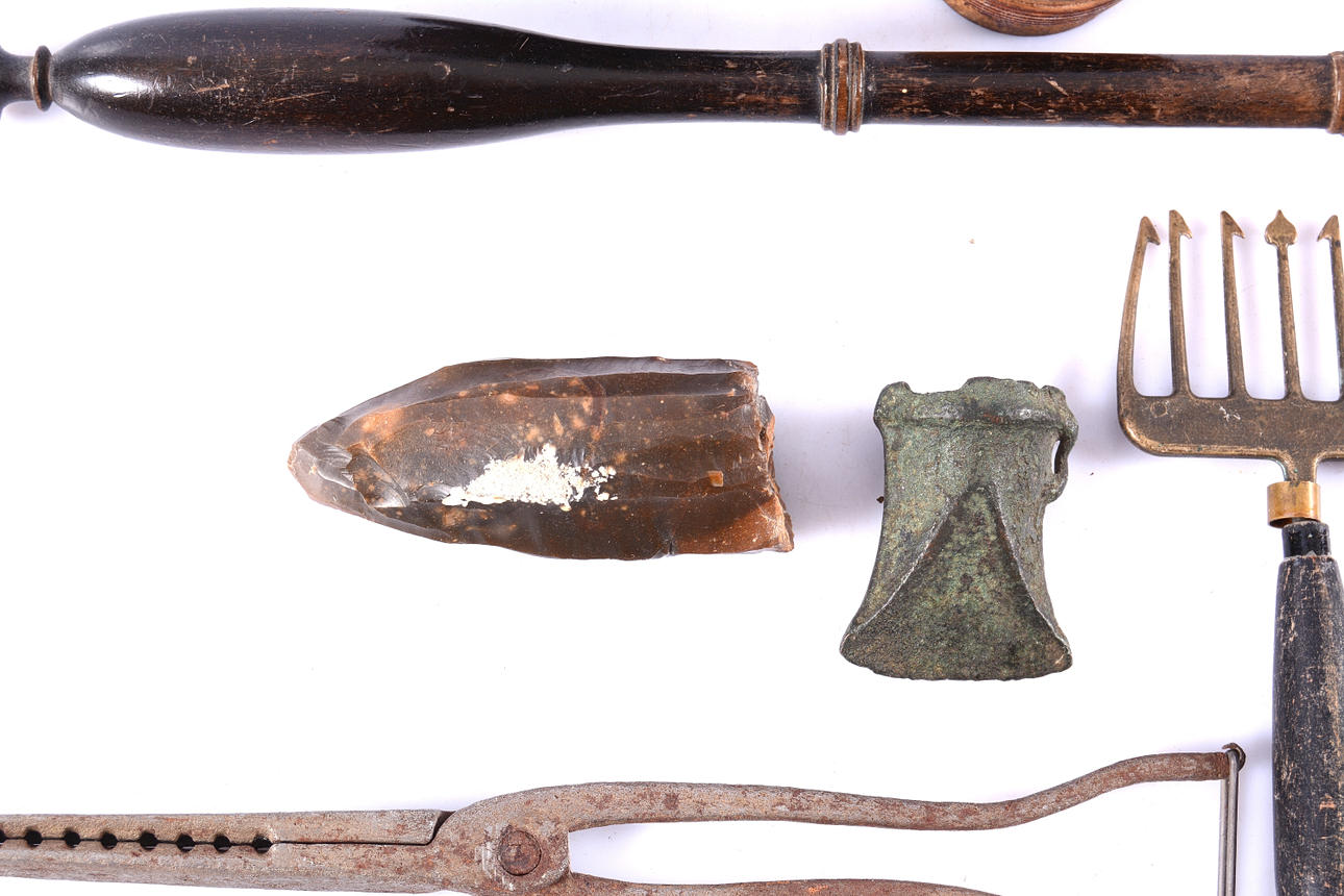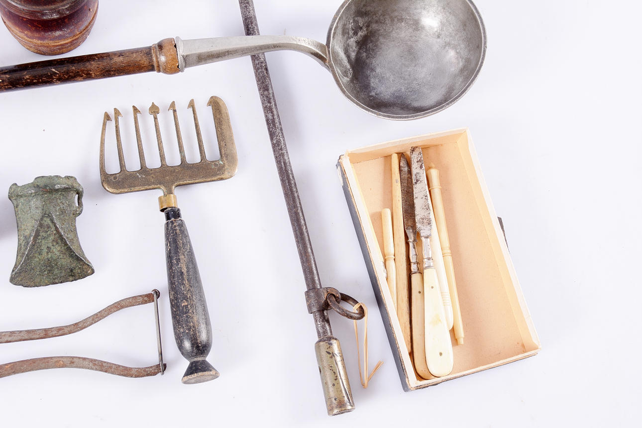 Tennslev, smidesljusstake 1900-tal, småknivar, bronsfragment mm.