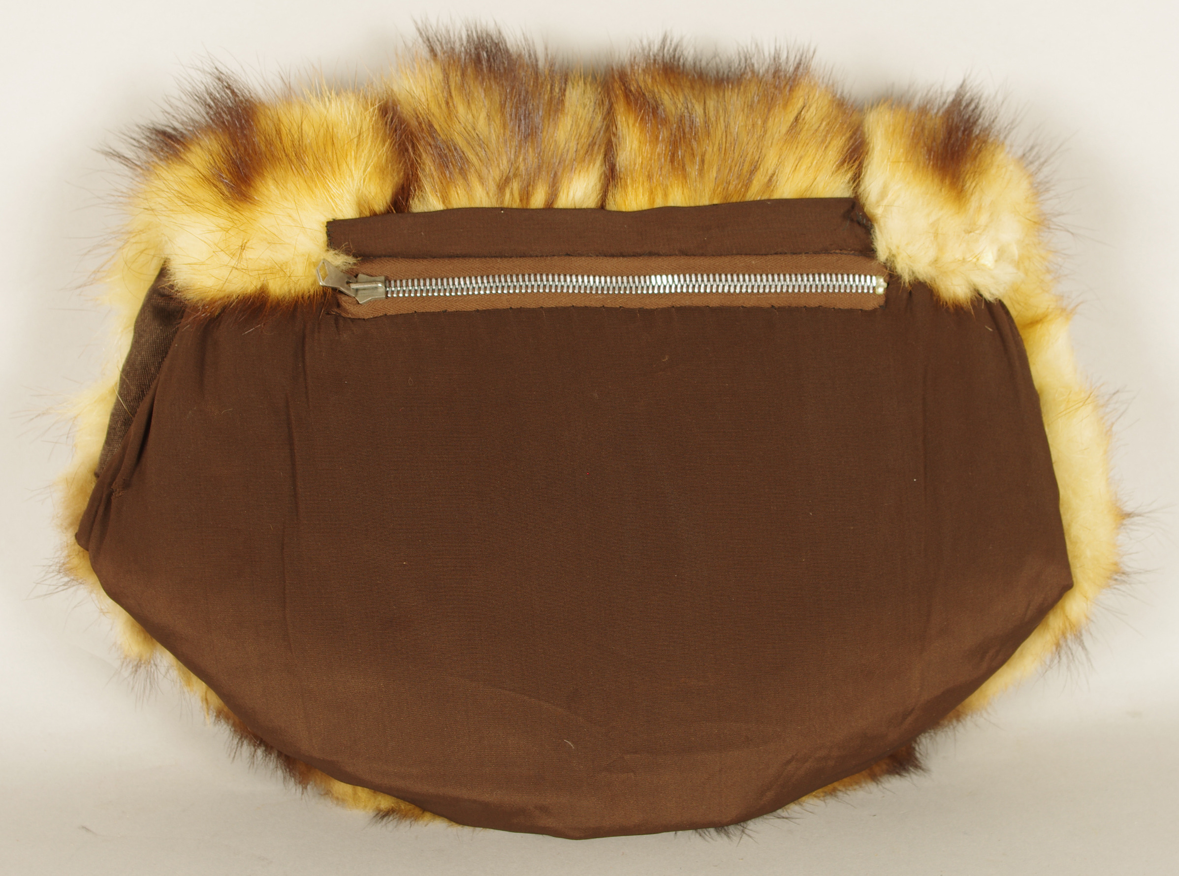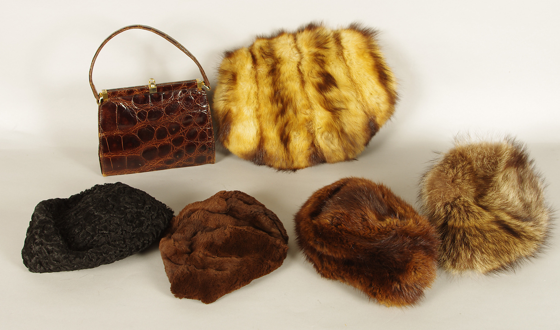105904. 4 PÄLSMÖSSOR, MUFF SAMT HANDVÄSKA.