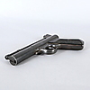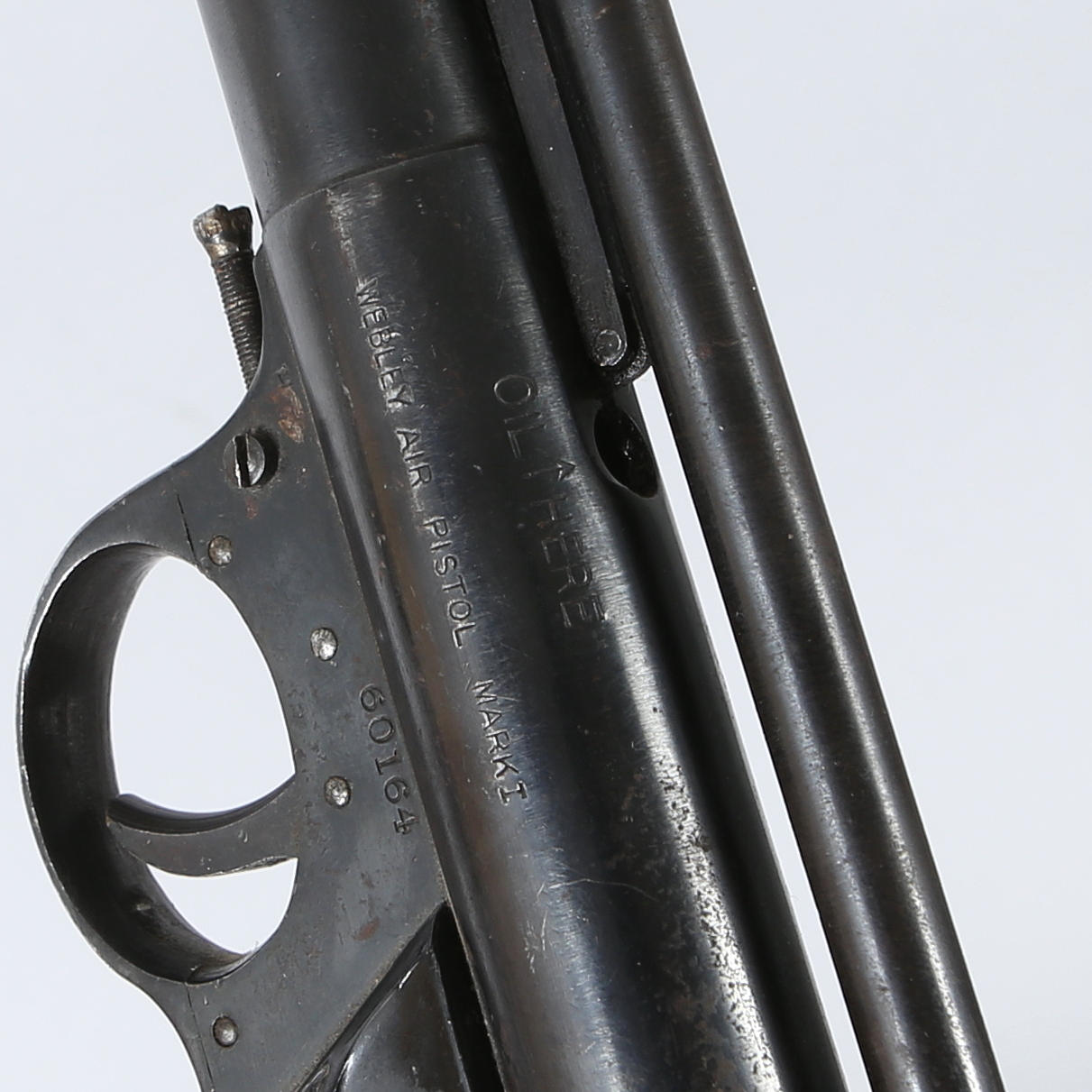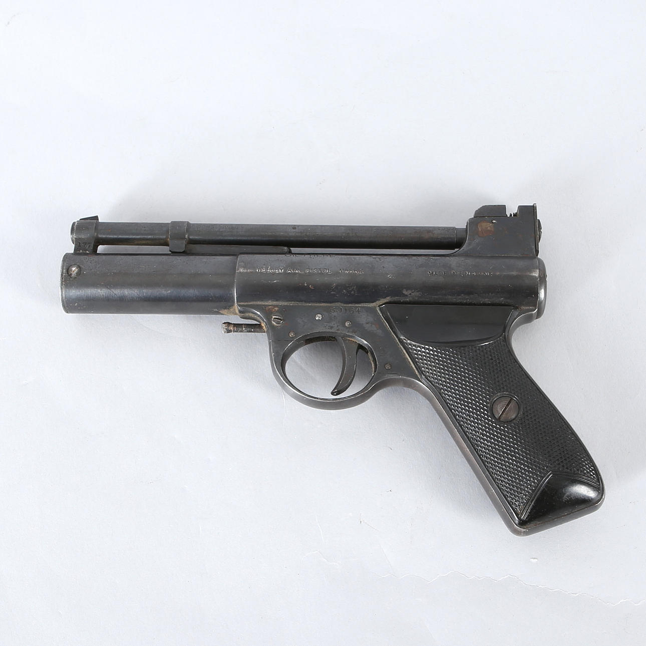 Svärtat stål och bakelit. .177 cal, (4,5 mm) Längd ca 21 cm.