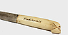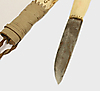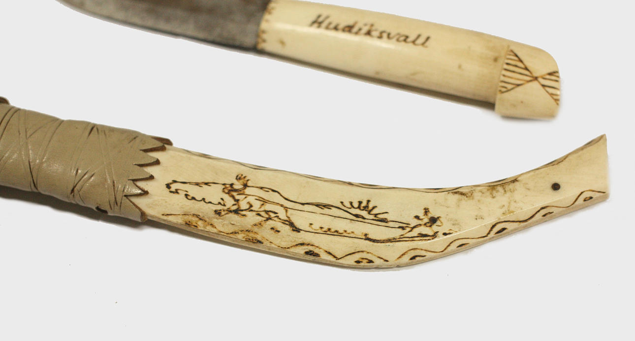 Fjäll-landskap med renar och fjäll. Märkt Hudiksvall. Ben och läder, längd ca 21,5 cm.