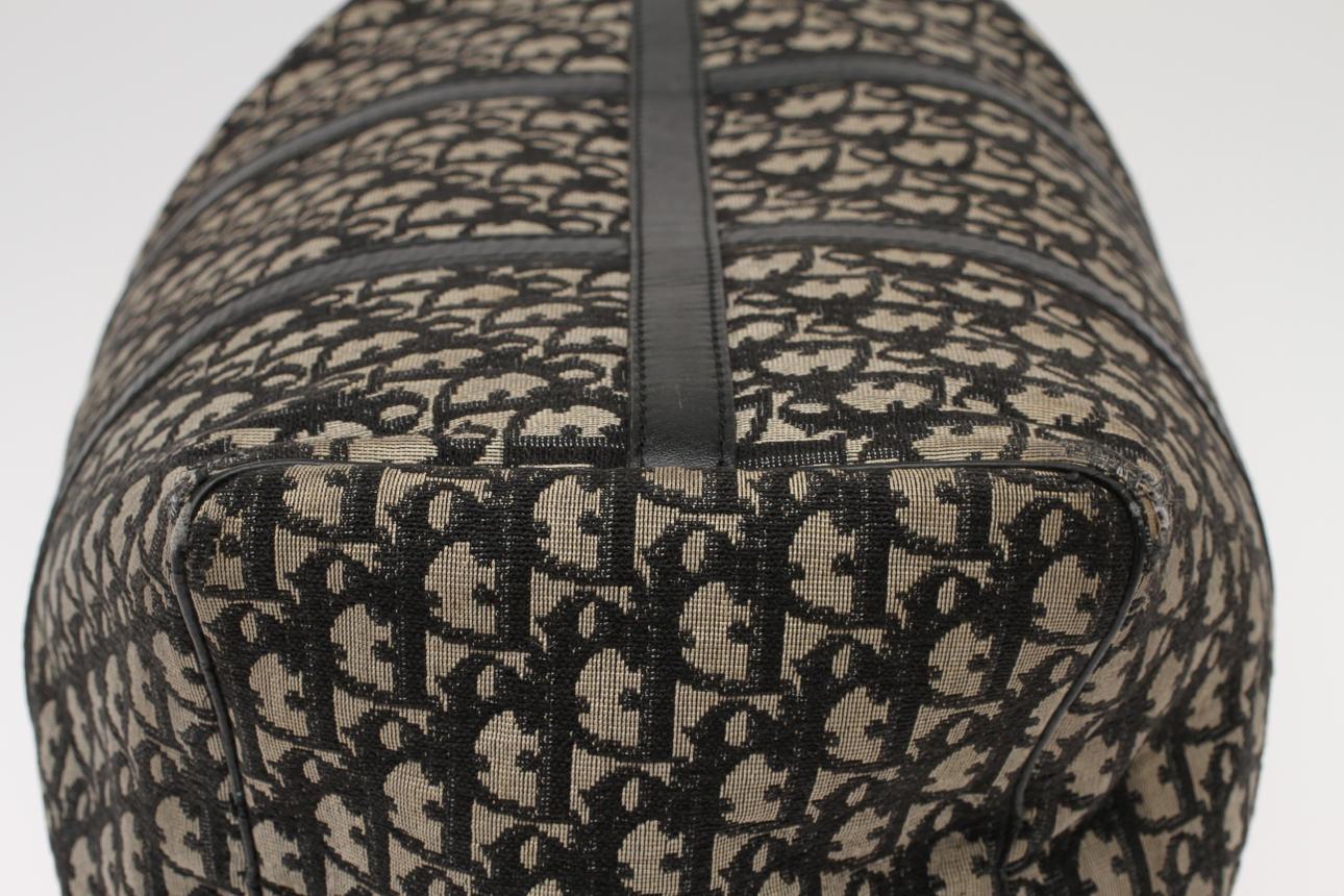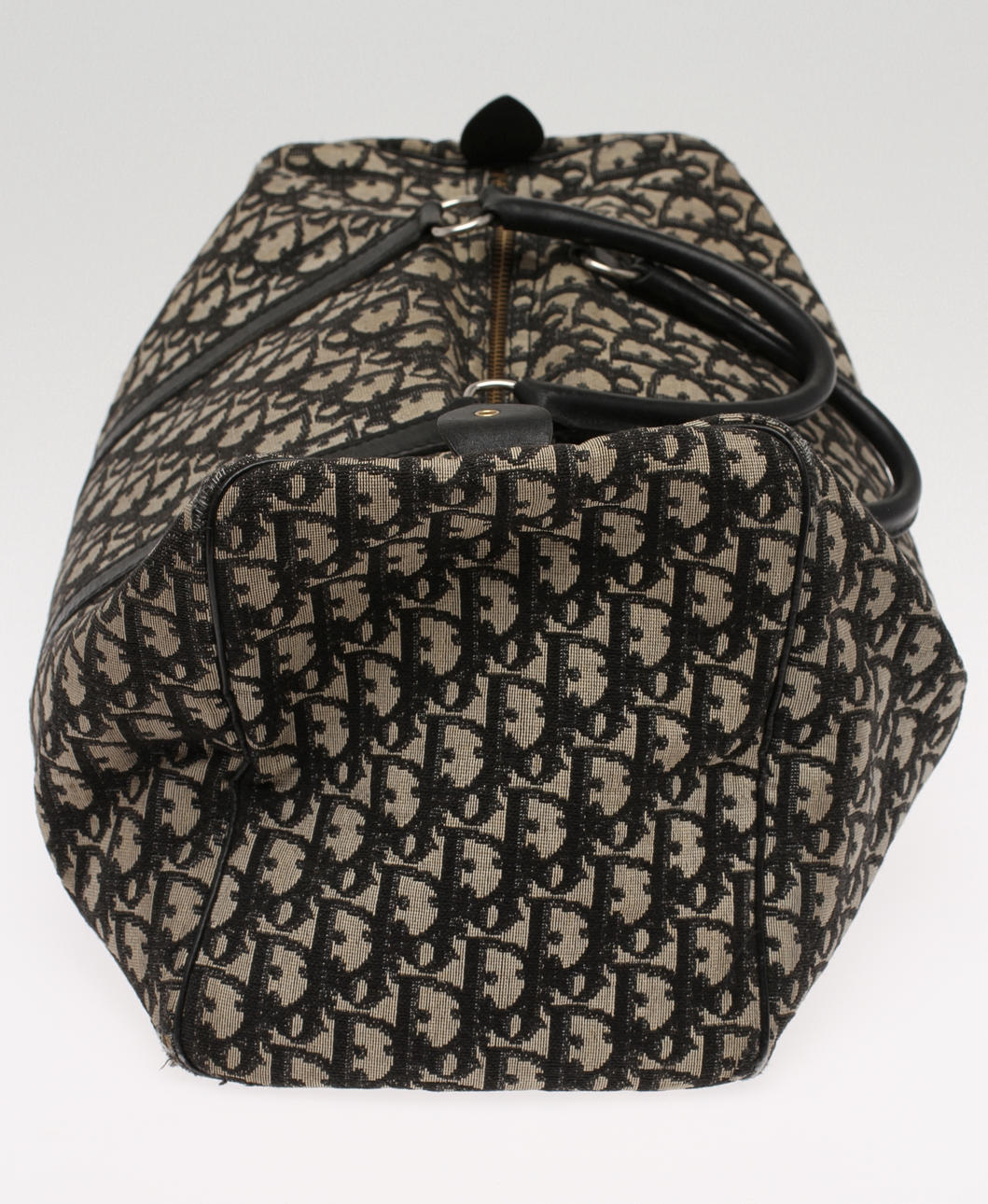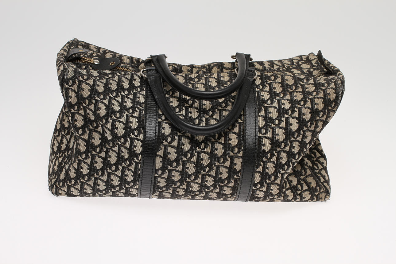 Tygetikettmärkt "Christian Dior Bagages Paris Made in France" samt "made in France garanti Scotchgard". Tyg och svart skinn. Längd , bredd , höjd cm.
