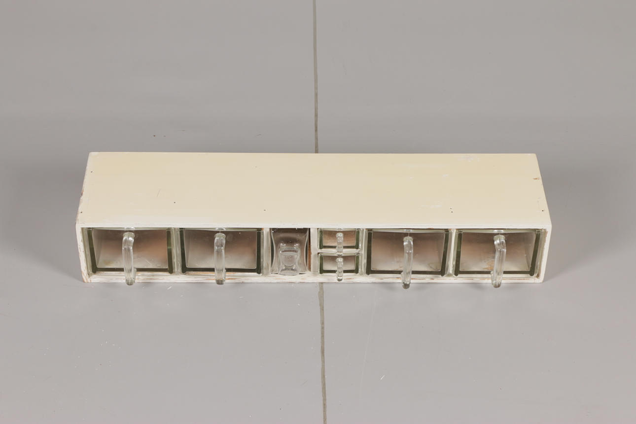 Specerihylla "Reda" med stomme i trä samt skeppor i glas.