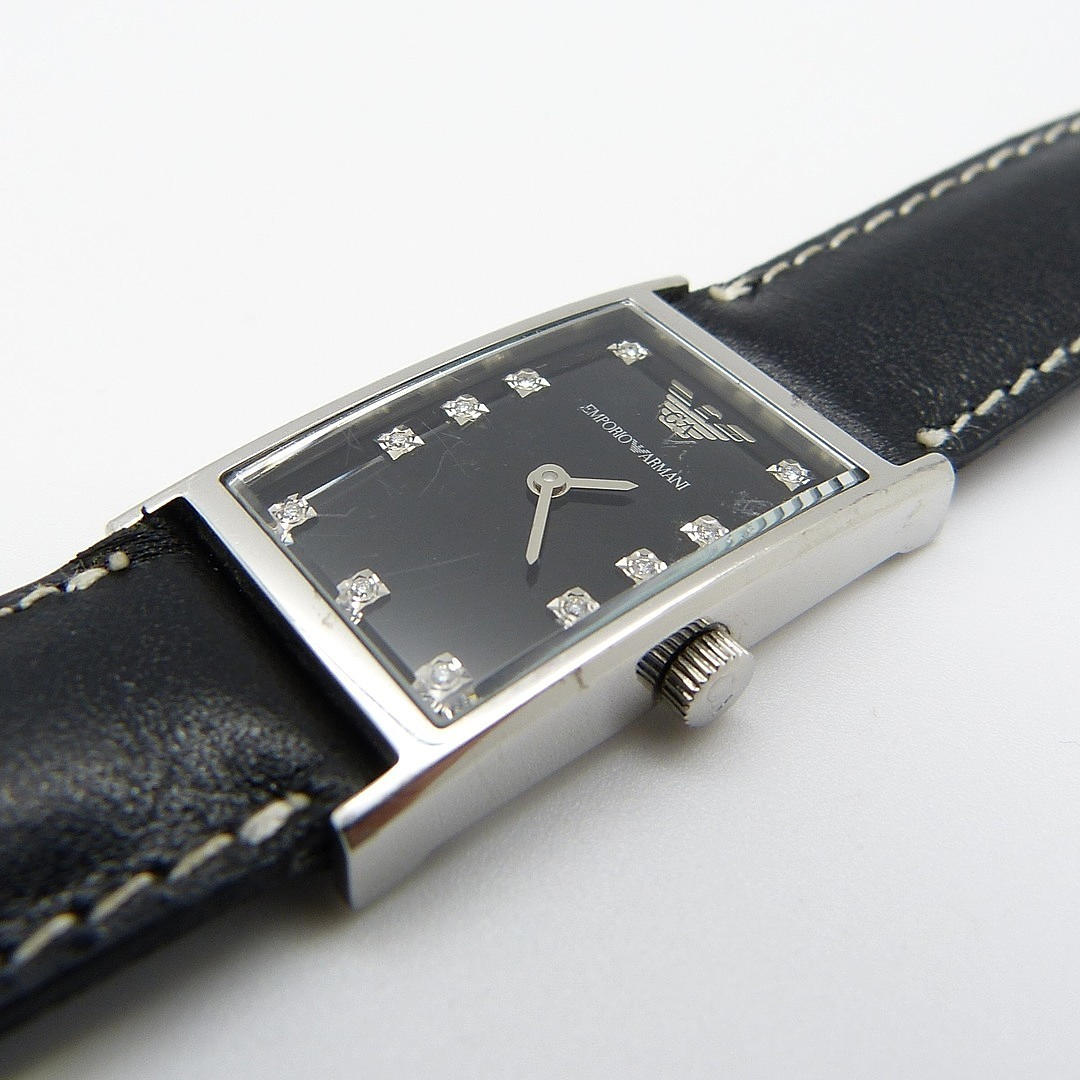 11 x små, rundslipade diamanter ställs in i ansiktet på denna klocka, som representerar timmarna. Den 12: e timmen representeras av Armani-logotypen.